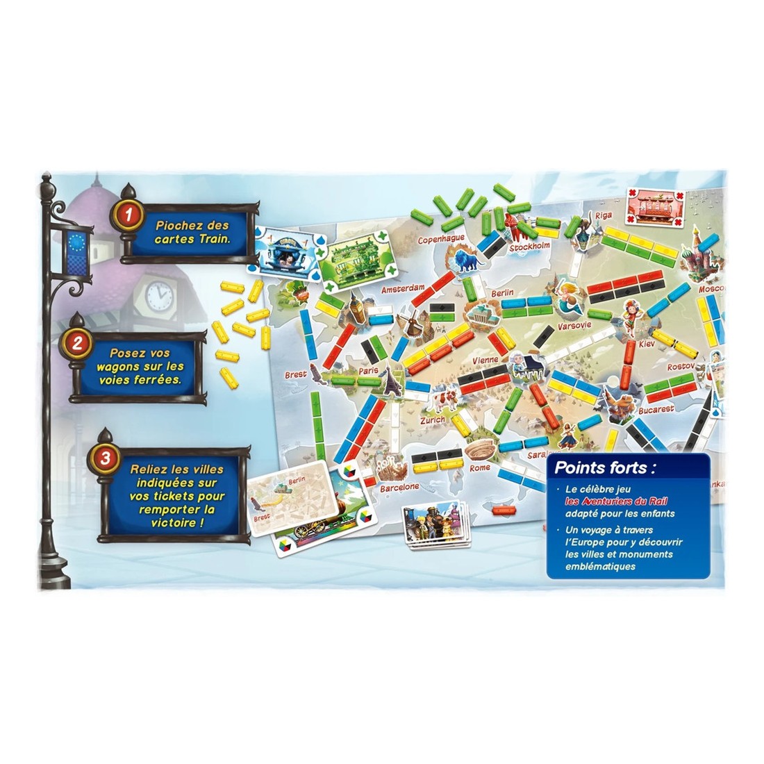 Le jeu reprend les éléments qui ont fait le succès de la série, mais les adapte pour les rendre accessibles aux plus jeunes. L'objectif final du jeu reste inchangé : visiter le plus de villes en Europe afin de construire le plus étendu des réseaux ferroviaires. Pour gagner les enfants devront collecter des cartes Wagon, prendre des routes et relier les villes listées sur leurs cartes Destination.