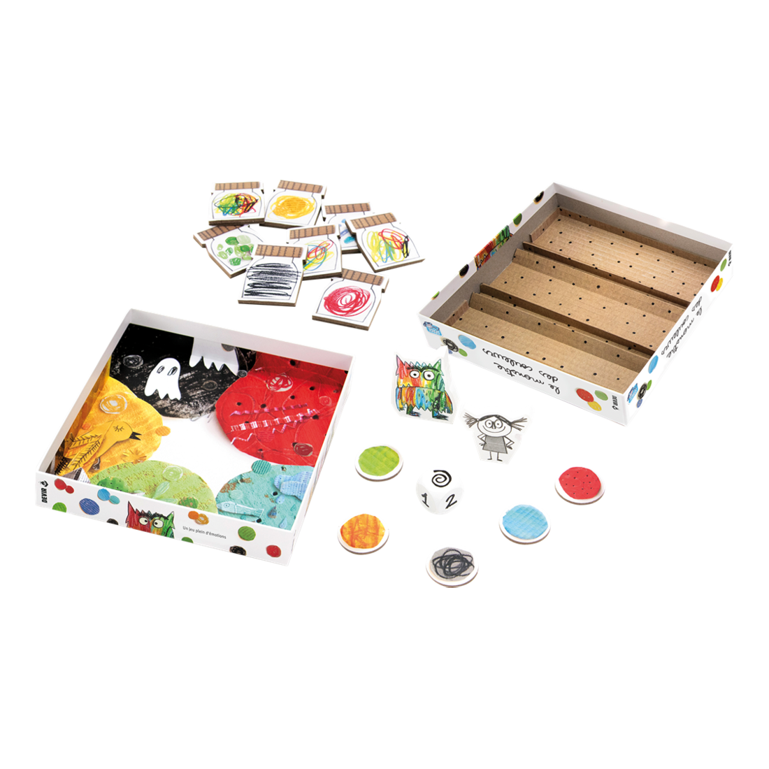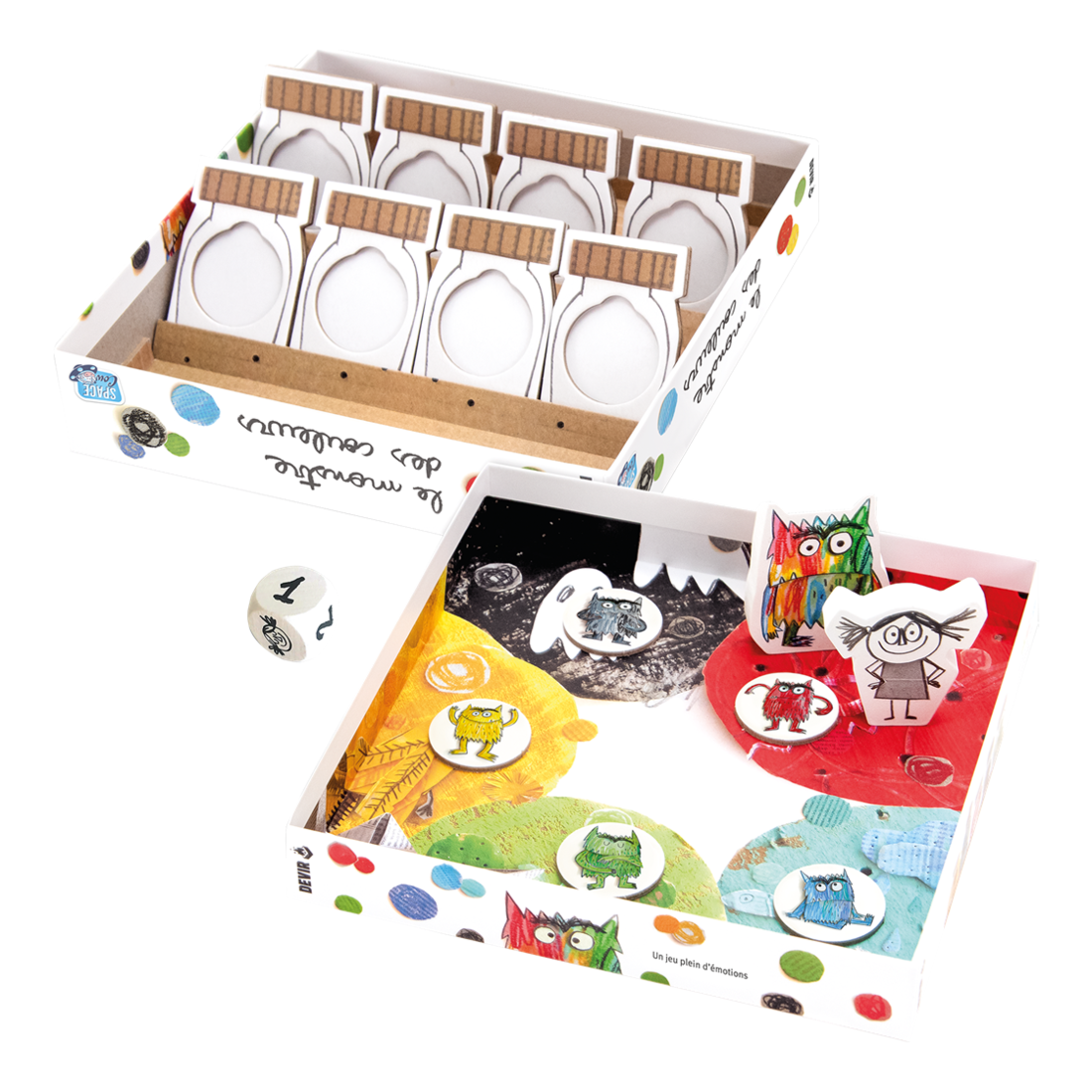 En jouant avec lui, vous lui montrez que les grands aussi vivent des émotions fortes ! De beaux moments de complicité à partager. Le design coloré et amusant rappelant le livre, et les éléments solides adaptés aux petites mains, renforcent le plaisir de jouer pour votre bambin. Contenu :1 plateau au fond de la boîte, 1 jeton de Monstre, 1 jeton de petite fille, un dé, 8 jarres en carton, 2 étagères pour les jarres, 5 marqueurs d'émotion.