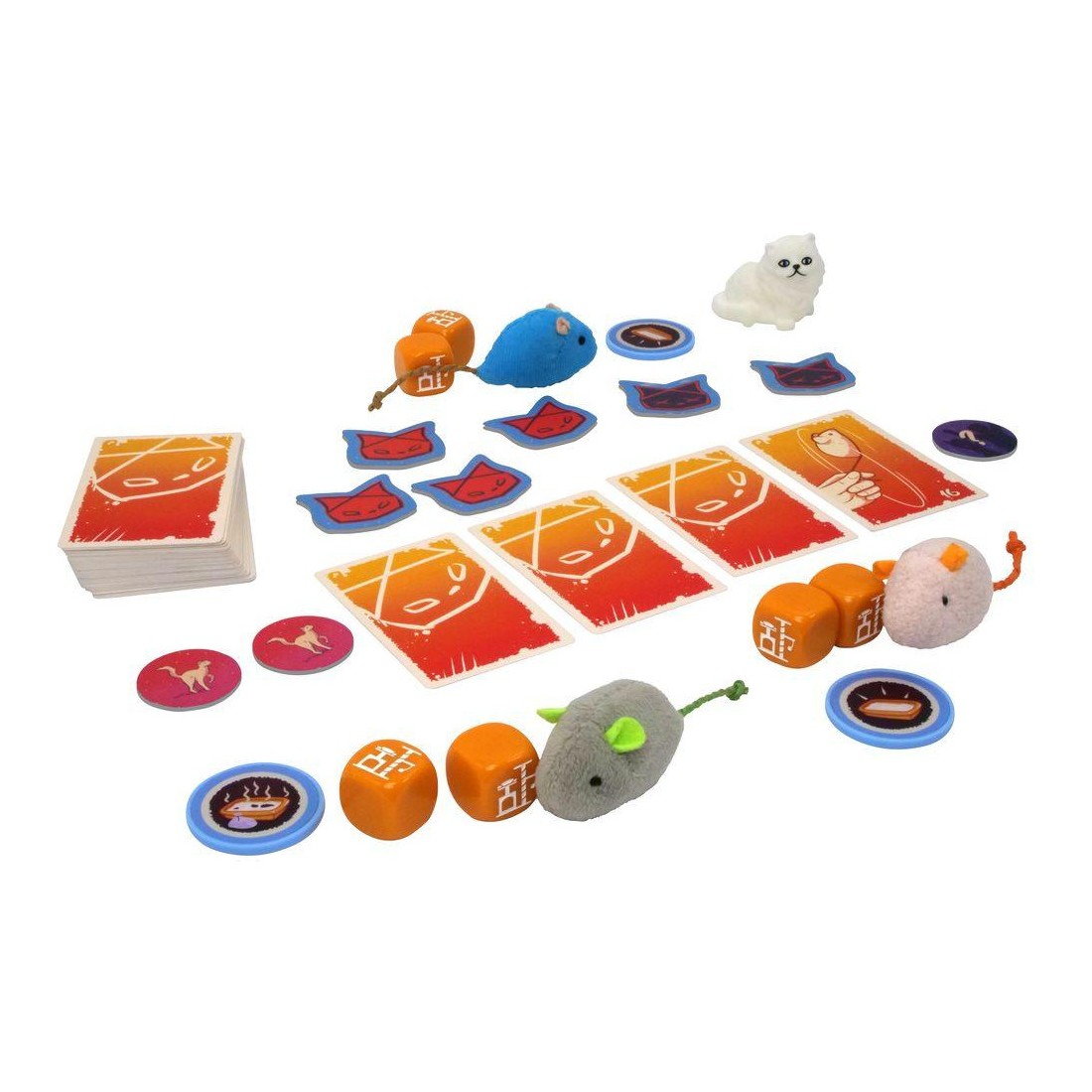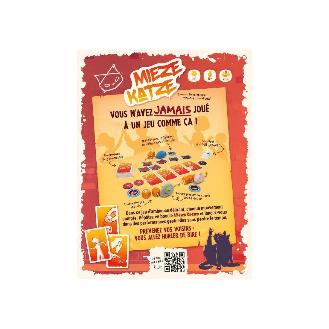 Contenu : 48 Cartes d’Action, 2 Jetons Mieze Katze, 1 Jeton Bouquet Final, 2 Cartes d’action vierges (pour vos propres idées), 9 Cartes Défi, 3 Jetons Défi, 9 Vies de chats, 1 Figurine Chat-sifflet, 6 Peluches de souris, 6 Jetons poker Litière, 12 Dés Arbre à chat, 2 Boîtes de rangement (pour stocker les composants), 1 Livret de règles, 1 Carte Tutoriel