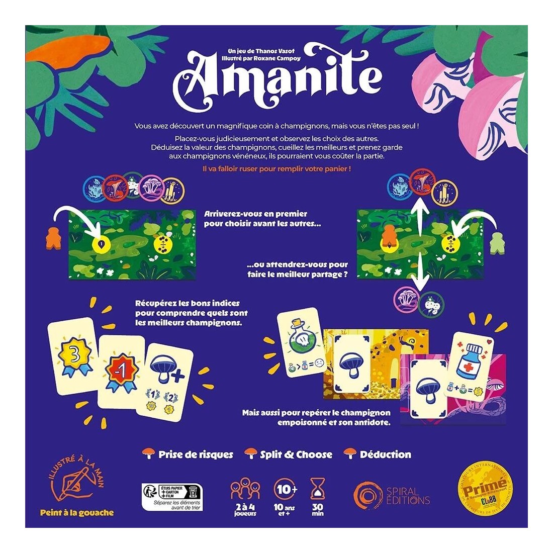 Dans le jeu Amanite, tout repose sur votre capacité à observer, déduire et prendre des risques calculés. Au cœur d’une forêt mystérieuse, les joueurs se lancent dans trois manches intenses où il s’agit de collecter les champignons les plus précieux tout en évitant les dangereux spécimens empoisonnés.