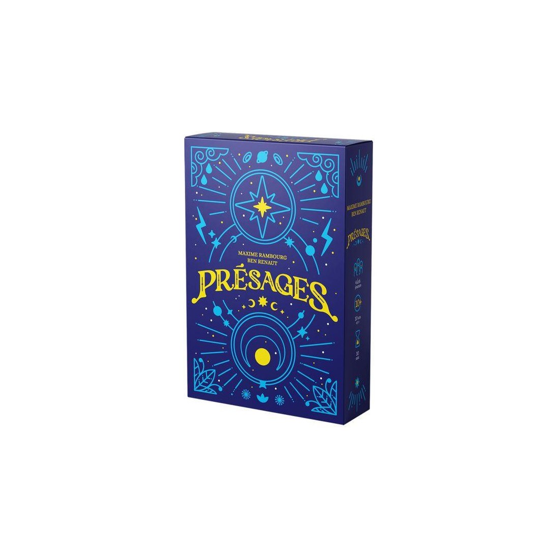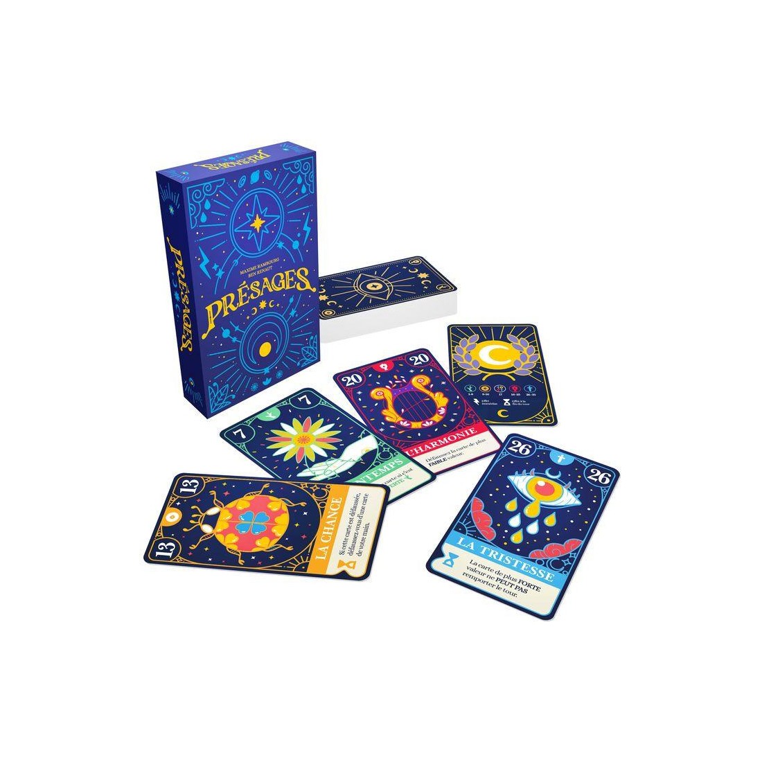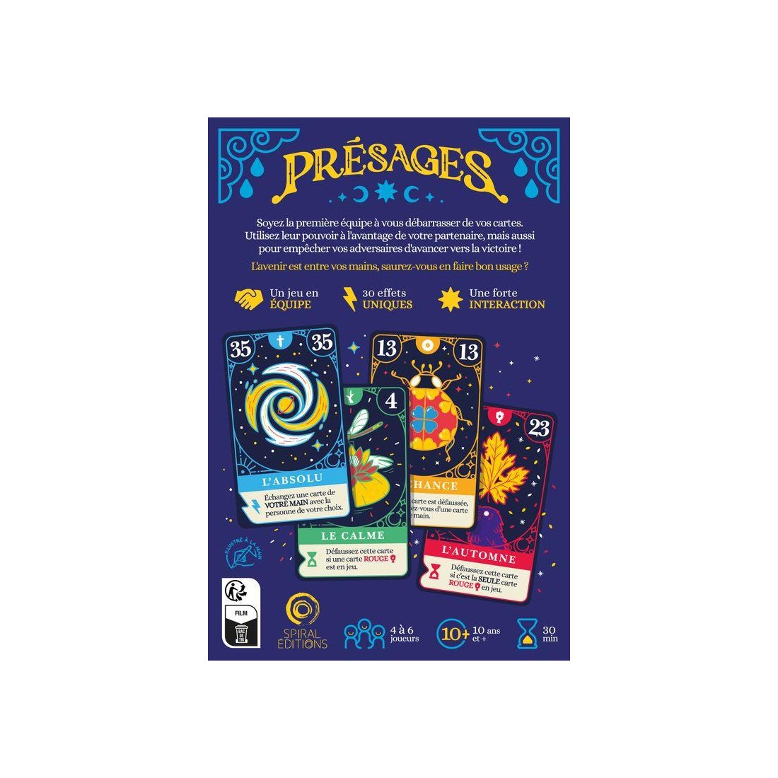 Dans Présages, vous faites équipe et vous devez vous débarrasser de vos cartes jusqu'à n'en avoir plus qu'une seule en main. Toutes vos cartes interagissent avec celles jouées par les autres membres de votre équipe mais également avec celles de vos adversaires. Jouez-les au moment opportun !