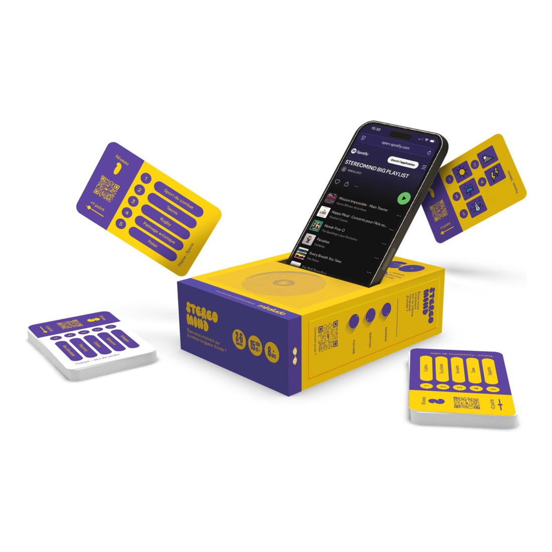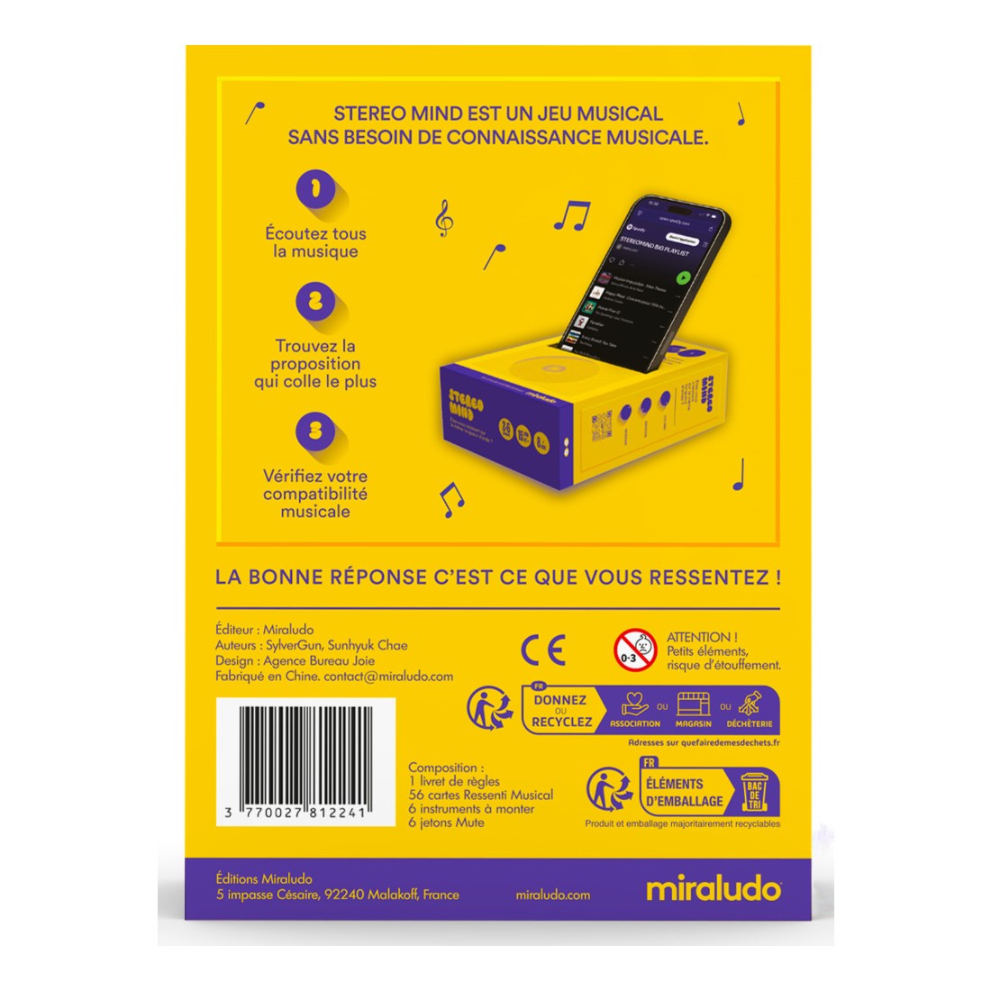 Stereo Mind est un jeu musical sans besoin de connaissance musicale. Le jeu se joue de 2 à 6 joueurs. Tout le monde écoute le même morceau de musique, puis chacun associe son ressenti à une proposition. Ce morceau vous fait penser à : "une ballade sous la pluie", "une sieste au soleil"... Quand chacun a fait son choix, on découvre les réponses.