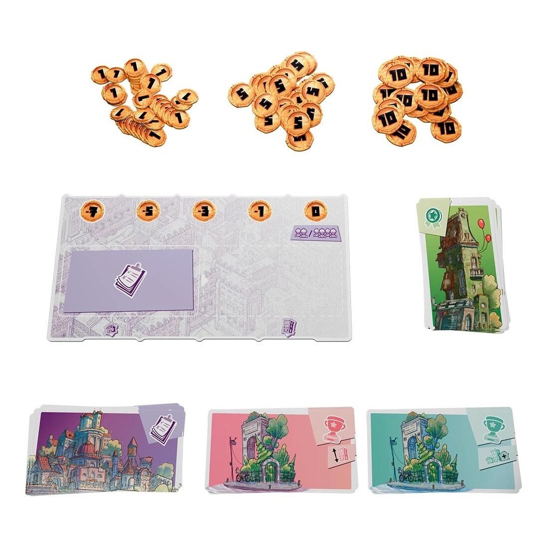 Le plateau modulable assure une grande rejouabilité : chaque configuration modifie les zones les plus attractives et renouvelle les stratégies. Les bâtiments s’empilent physiquement, donnant une lecture immédiate de la verticalité et du potentiel de score.