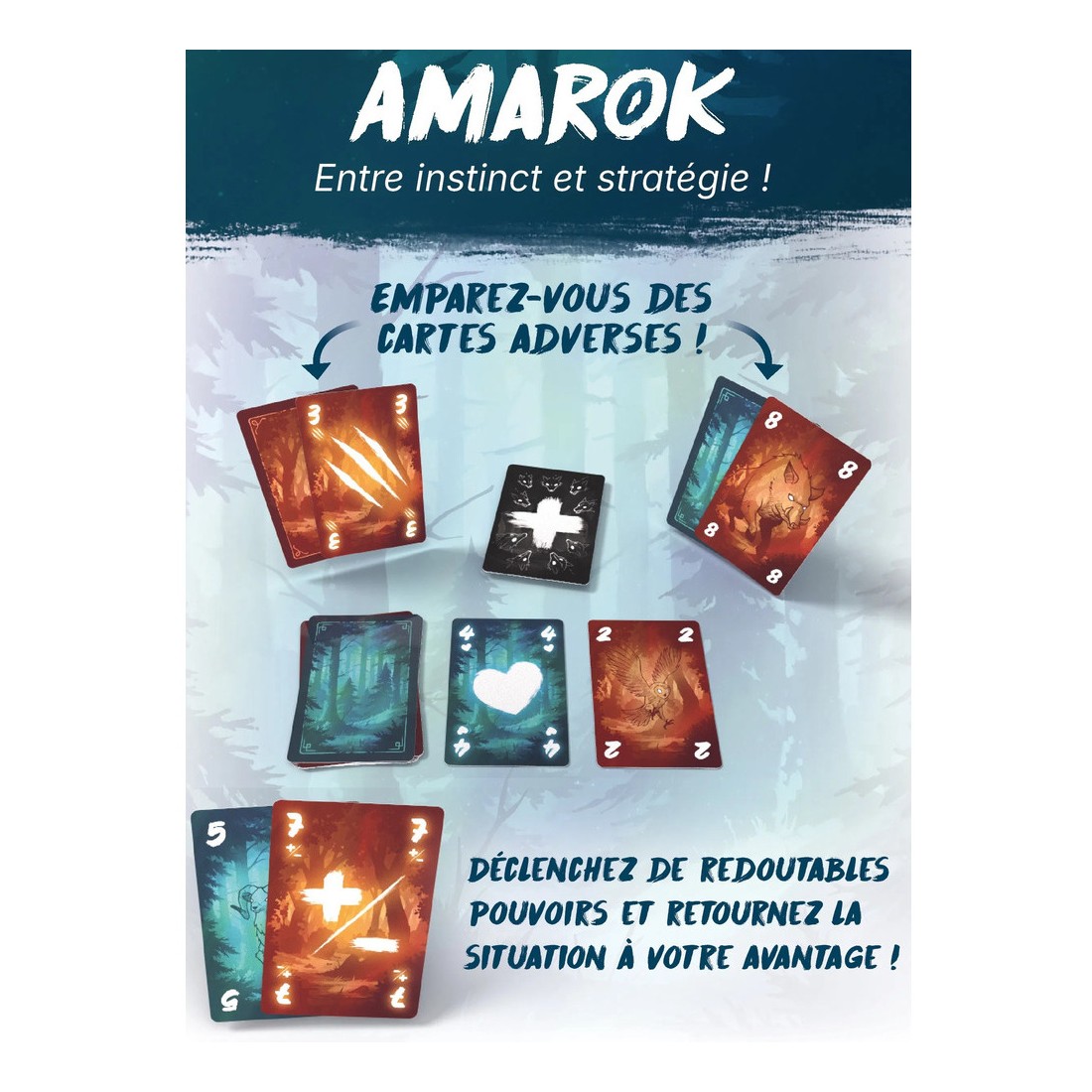 Incarnez Amarok, l'esprit loup des Inuits, gardien ancestral des forêts et des symboles. Fiez-vous à votre instinct pour pénétrer au cœur de la forêt et y imposer la loi de la nature ! Pour gagner à Amarok, il faudra lire dans l'âme de vos adversaires. Ce tic nerveux est-il un aveu, ou une ruse savamment orchestrée pour vous manipuler ? Entre le piège et la vérité, quand votre esprit hésite, faites confiance à votre instinct. Il est souvent le seul à flairer le danger. En mode équipe, le jeu prend une autre saveur où il va falloir vous comprendre ensemble pour emporter la victoire finale ! Contenu:- 1 Règle du jeu