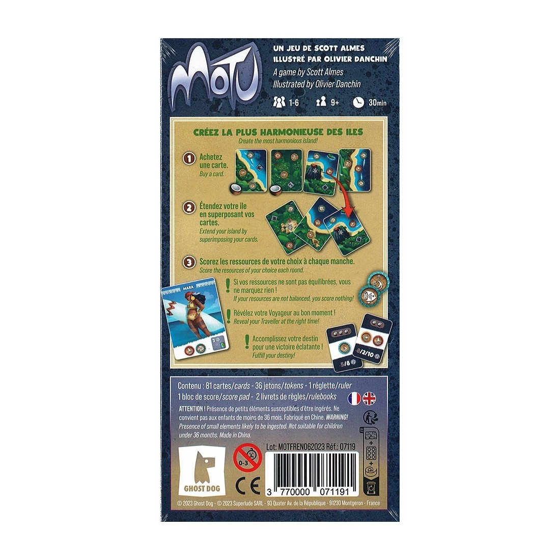 Une partie de Motu se joue en 9 tours. À chaque tour, un joueur prend une carte de la Ligne et l’ajoute à son ile en la superposant à une ou plusieurs autres cartes déjà en place en recouvrant au moins un symbole de son ile. Trois fois par partie, les joueurs font un décompte intermédiaire de leurs points de victoire (appelés ici Points d’harmonie) avant de les cumuler lors du décompte final.