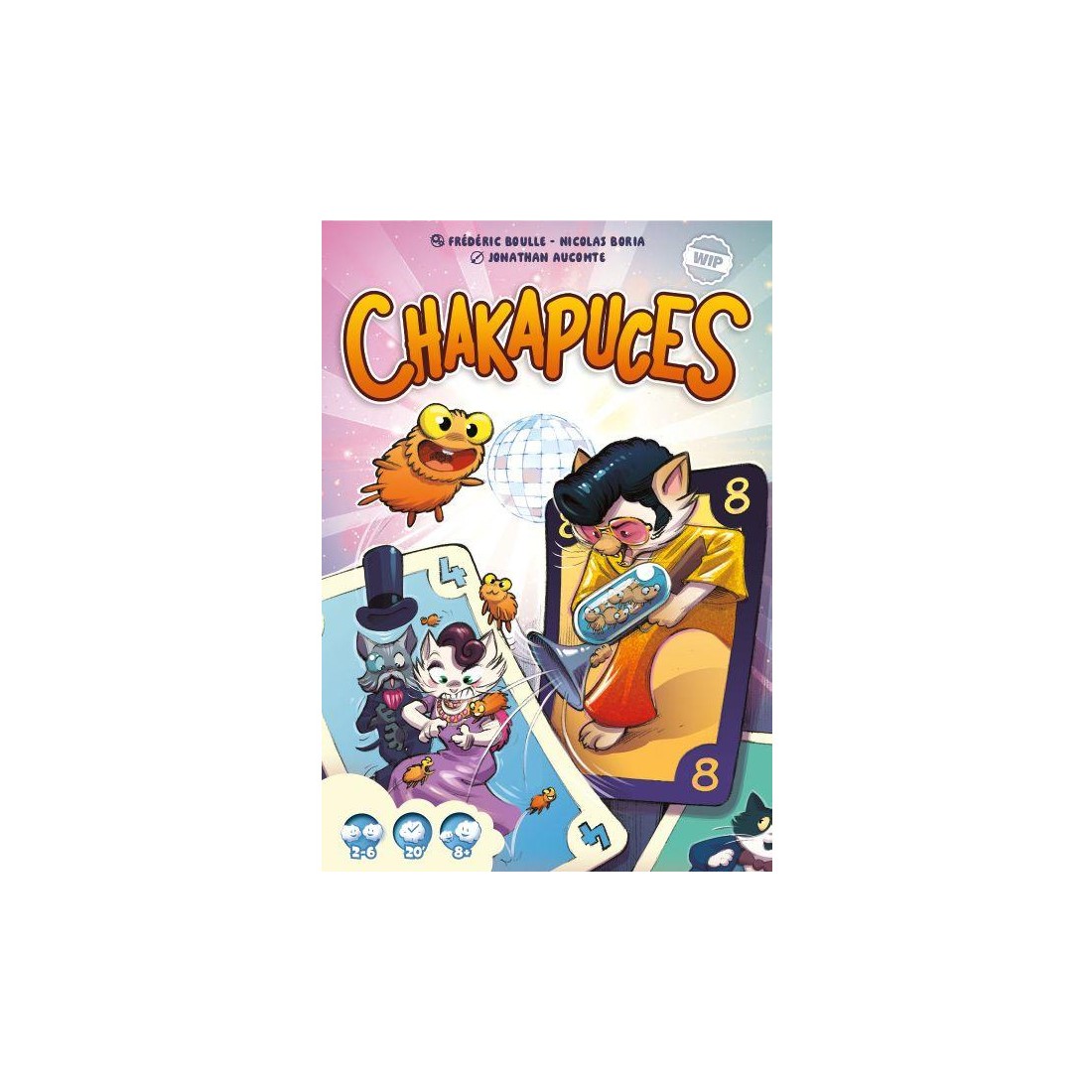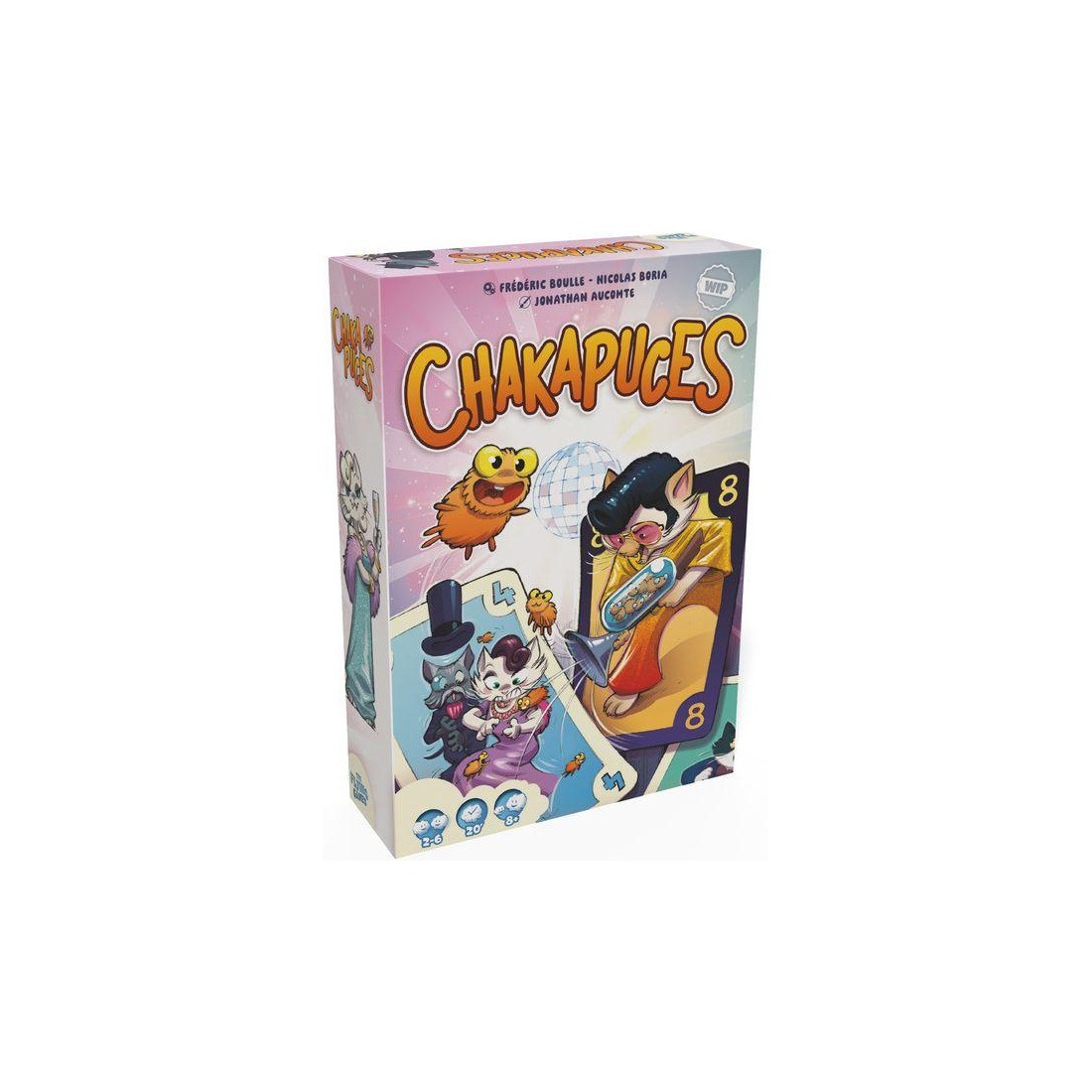 Contenu : - 76 cartes numérotées de 1 à 10 dont :, 64 cartes Chat, 12 cartes Chakapuces, - 70 jetons Puce (valeur de 1.3 et 5)
