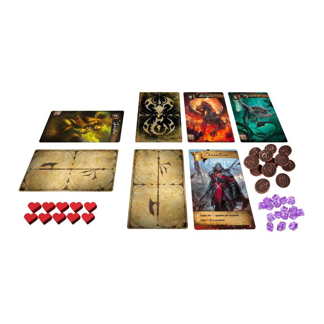 Contenu : • 35 cartes, • 35 protège-cartes (sleeves), • 30 gemmes en acrylique, • 16 pièces Gloire en métal, • 10 tokens Cœur en bois, • 1 livret de règles,