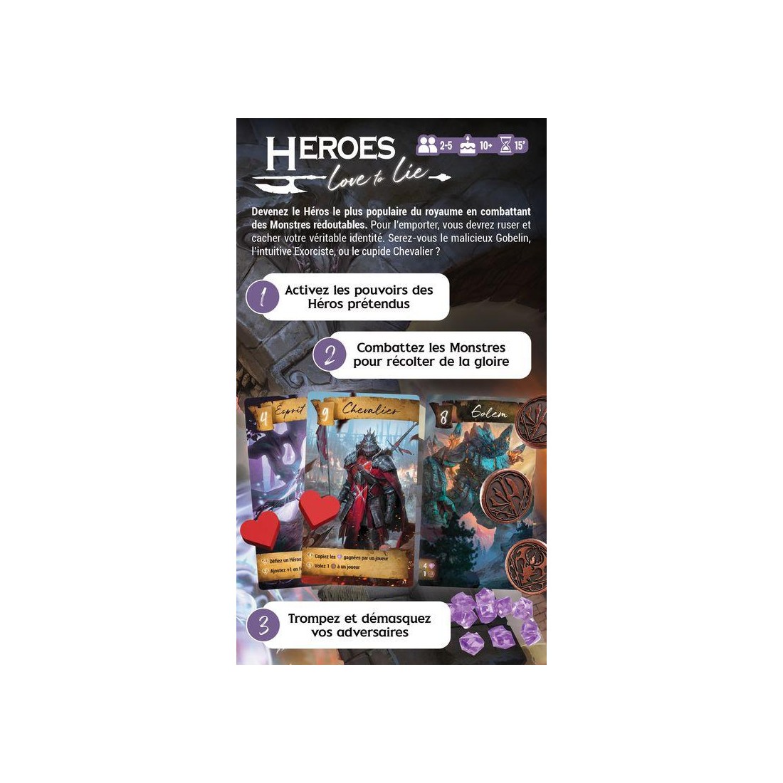 Heroes Love to Lie est un jeu de bluff et de rôles cachés, plongeant les joueurs dans une atmosphère de tension et de mensonges stratégiques. L'objectif est de se dissimuler derrière une identité secrète tout en manipulant les autres joueurs. Manipulez, dissimulez, trompez. Prétendez être n’importe quel Héros – le Gobelin, l’Elfe, ou qui sait encore ? – et activez ses pouvoirs redoutables. Mais prenez garde à l’Exorciste, toujours prête à vous démasquer.
