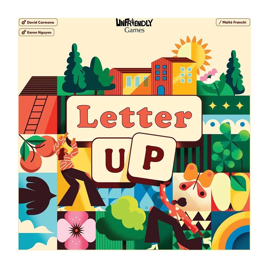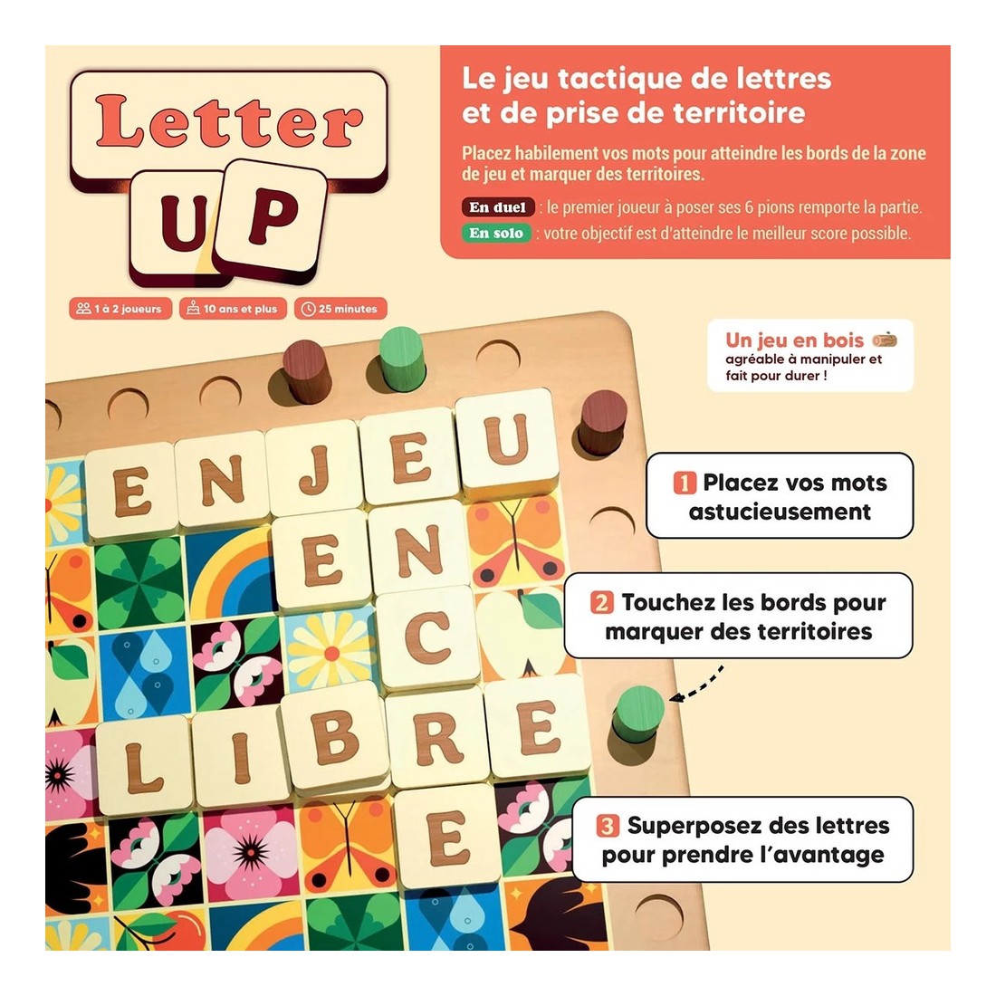 Dans le jeu Letter Up, les joueurs s’affrontent dans un duel de lettres, où bien savoir placer un mot est aussi important qu'avoir du vocabulaire. La mécanique de jeu repose sur la création de mots à partir de lettres en bois posées sur une grille centrale, avec pour objectif d'atteindre les bords de la zone de jeu pour y placer vos pions Territoire et prendre le contrôle de l’espace.