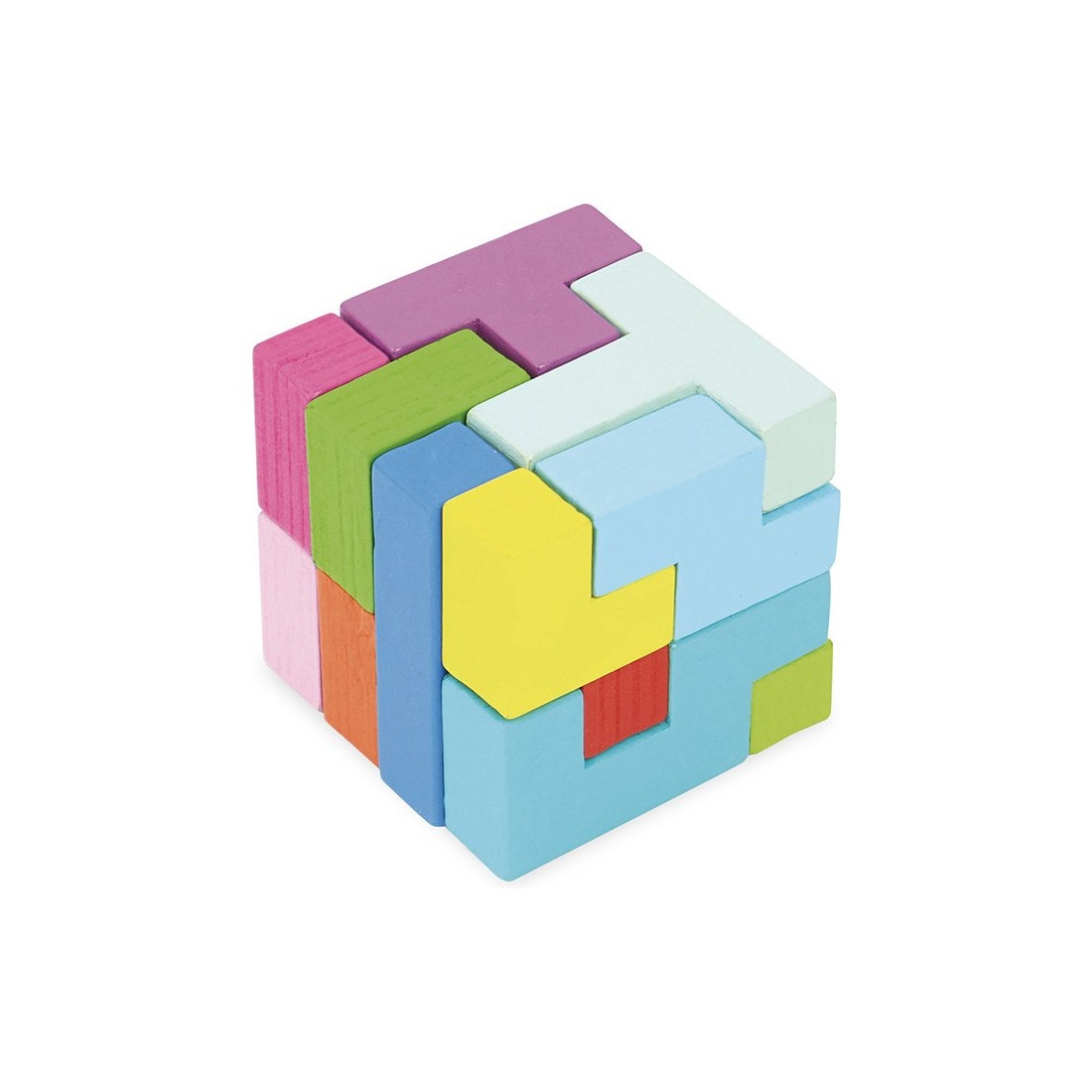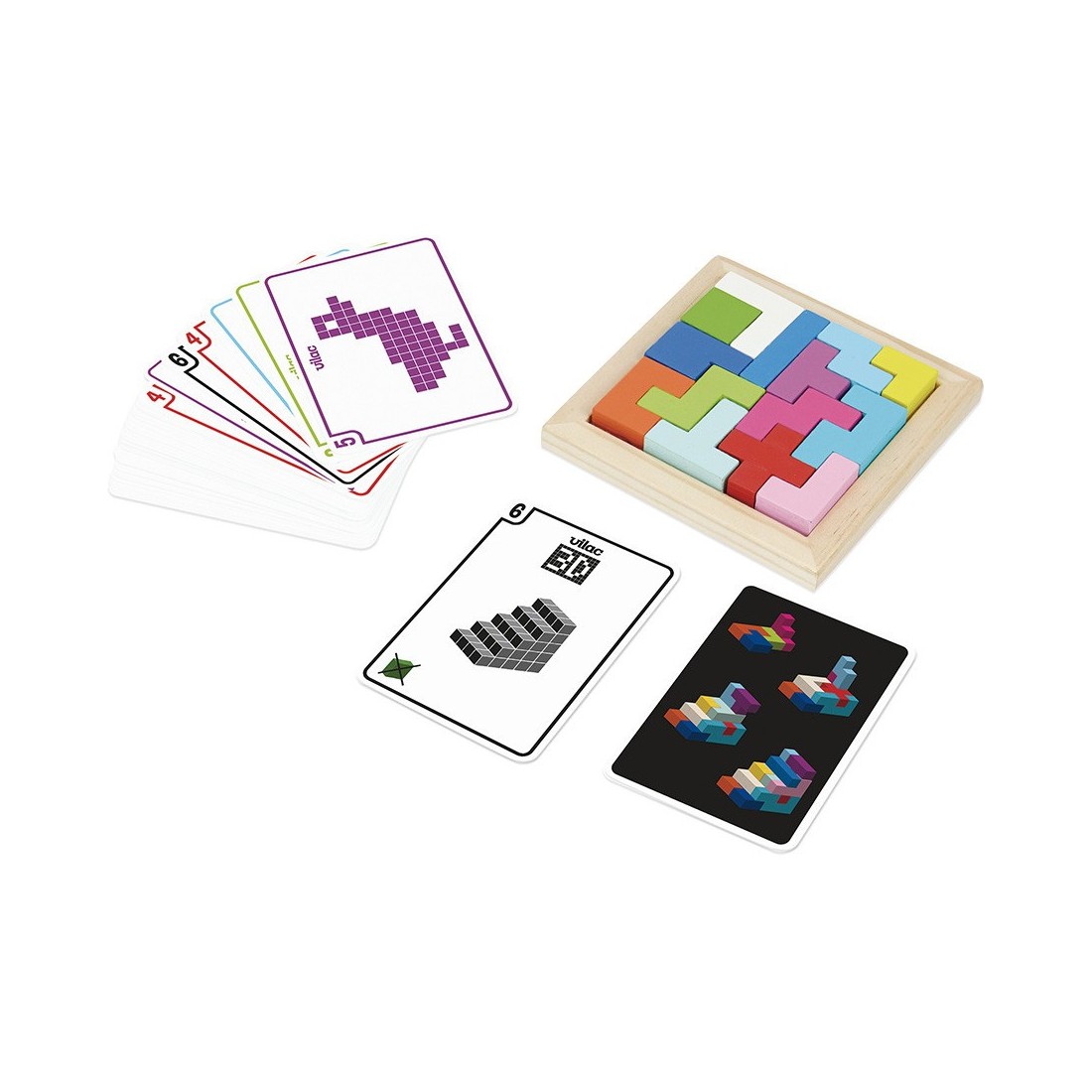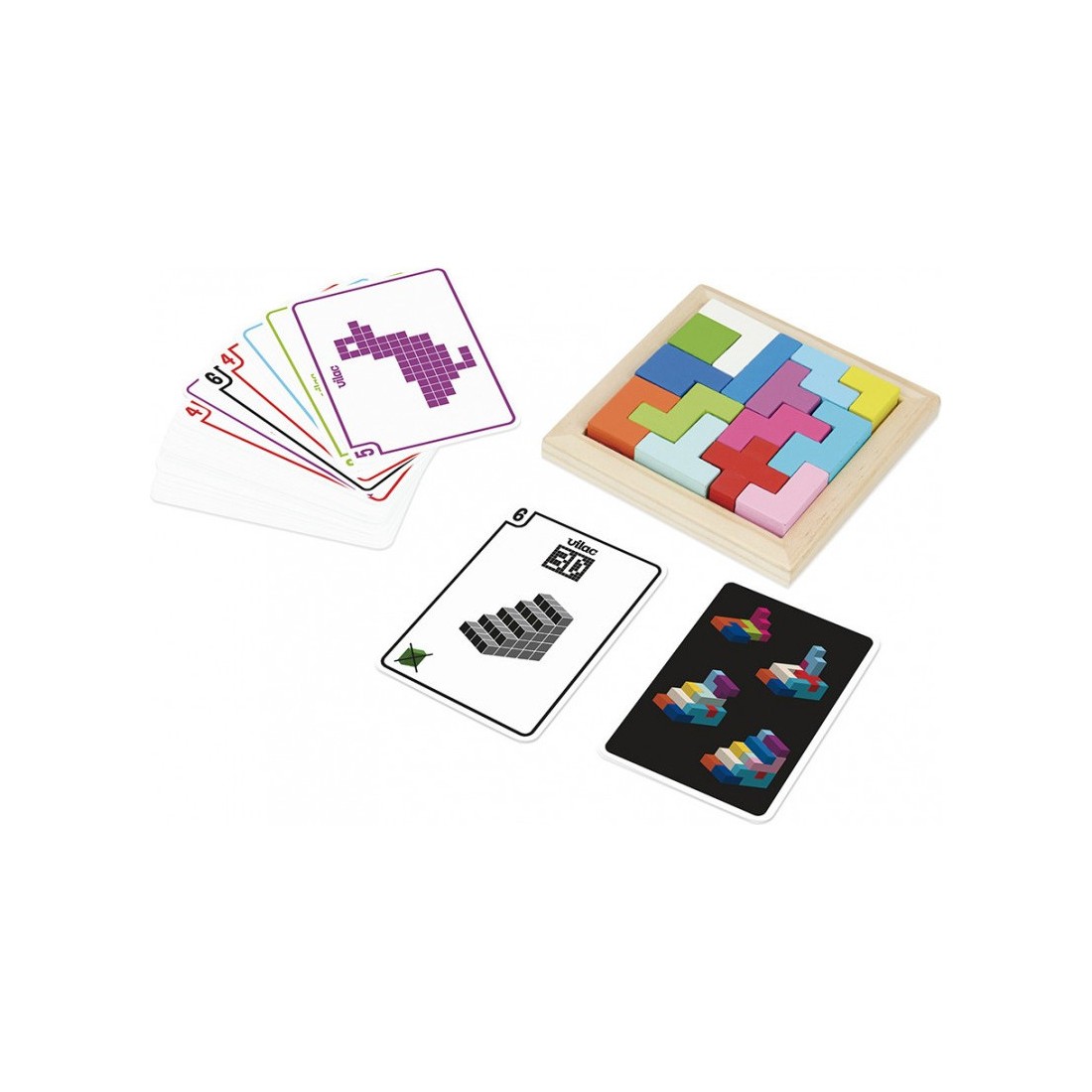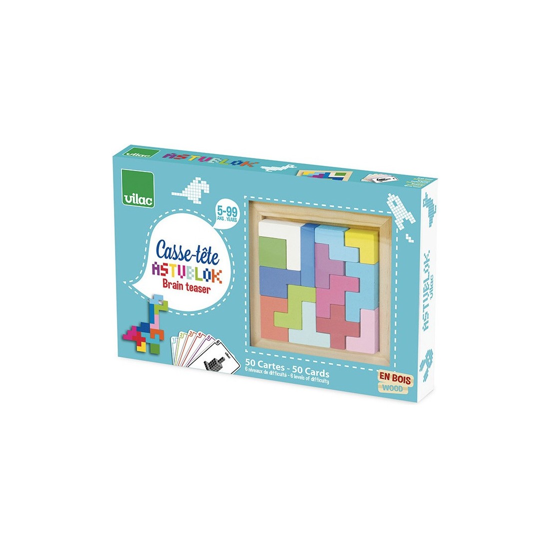 Astubloc - coffret casse-tête avec des formes géométriques en bois. Livré avec 50 cartes de modèles et de niveaux différents pour résoudre des casse-tête en 2D mais également en 3D ! A partir de 5 ans.