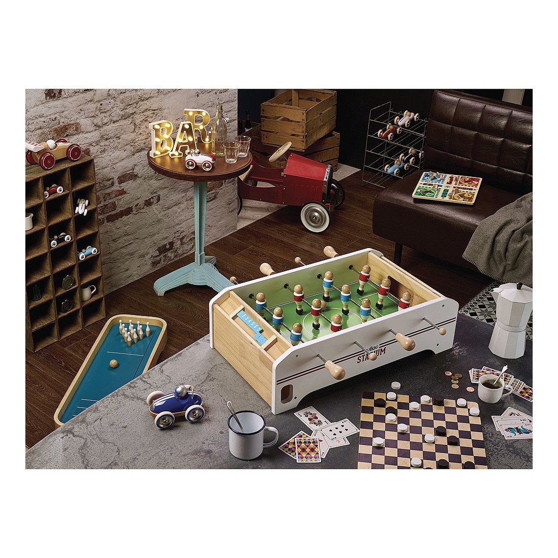 Joli petit babyfoot de table, à poser pour des parties de folie ! Babyfoot en bois 12 joueurs et 3 balles en liège, avec un compteur de points pour chaque équipe. À partir de 4 ans.