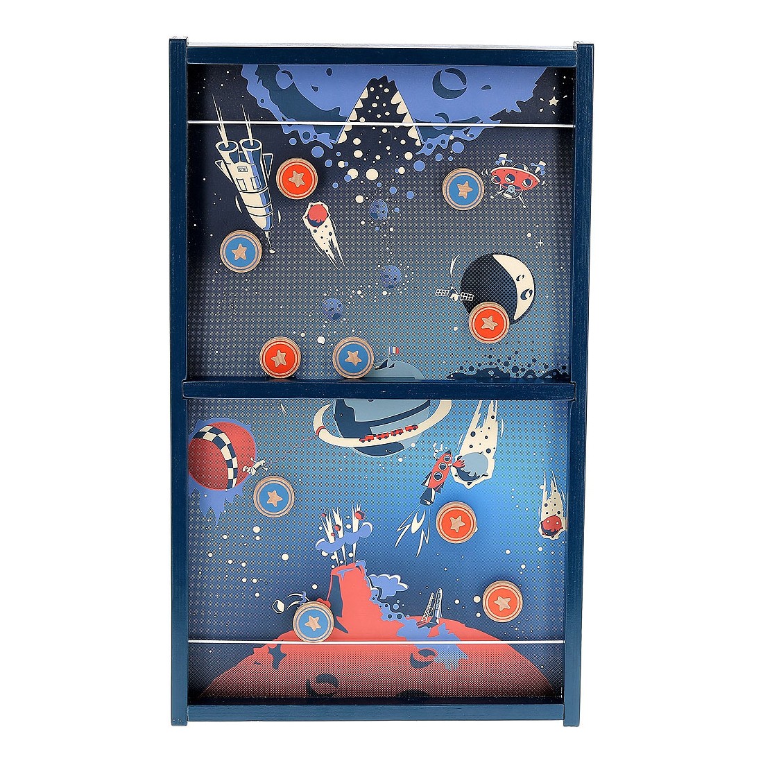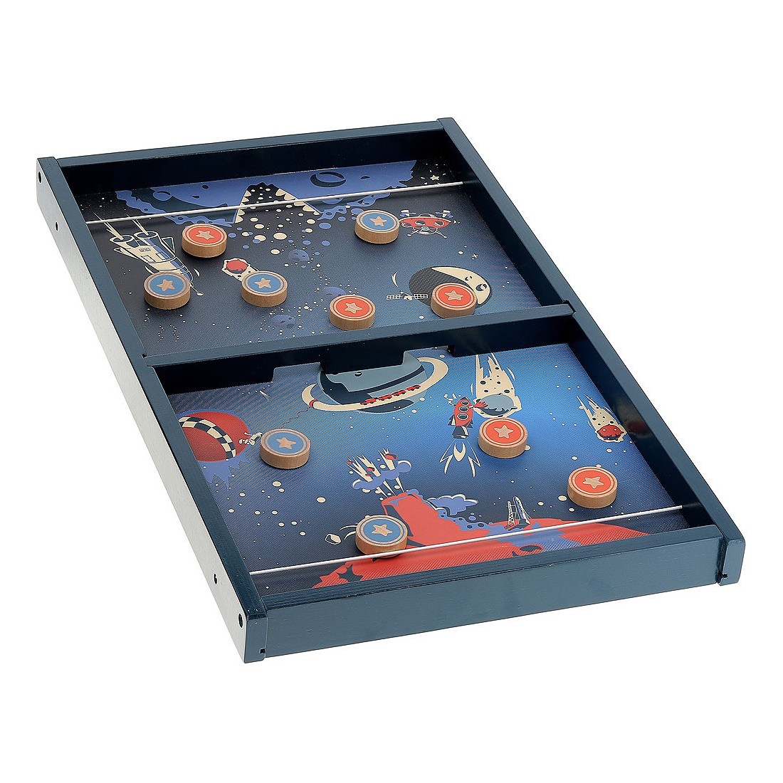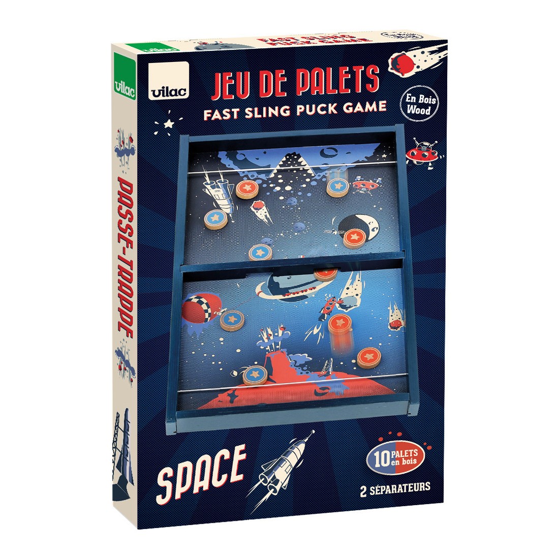 3… 2… 1… décollage immédiat ! Voyagez dans l'espace, à bord du vaisseau Vilac dans ce magnifique jeu de palets au look vintage. Le but est de se débarrasser de tous ses palets avant son adversaire ou, encore plus difficile, de ne plus avoir un seul palet de son côté. Il faut se servir de l'élastique de son côté comme lanceur et être le plus habile pour viser l'unique trou au centre du jeu.