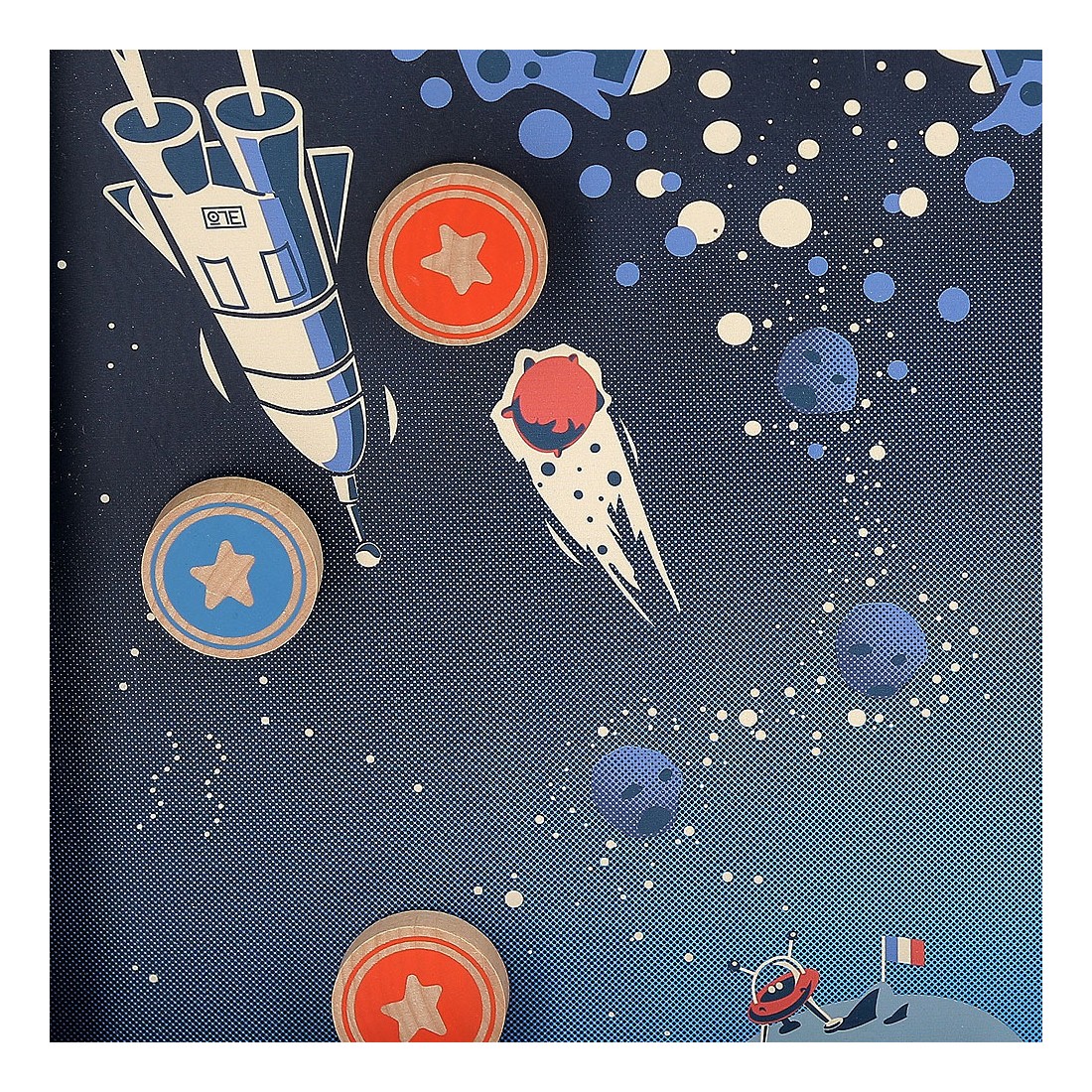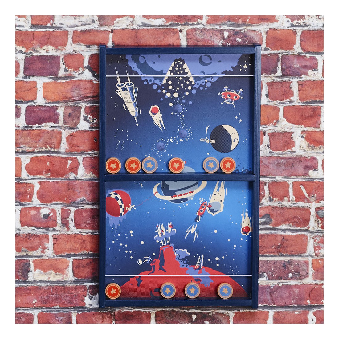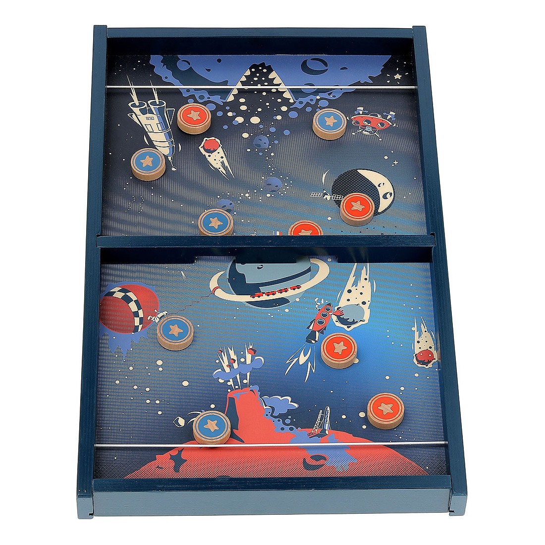 3… 2… 1… décollage immédiat ! Voyagez dans l'espace, à bord du vaisseau Vilac dans ce magnifique jeu de palets au look vintage. Le but est de se débarrasser de tous ses palets avant son adversaire ou, encore plus difficile, de ne plus avoir un seul palet de son côté. Il faut se servir de l'élastique de son côté comme lanceur et être le plus habile pour viser l'unique trou au centre du jeu.