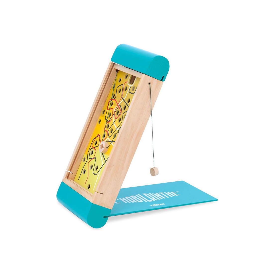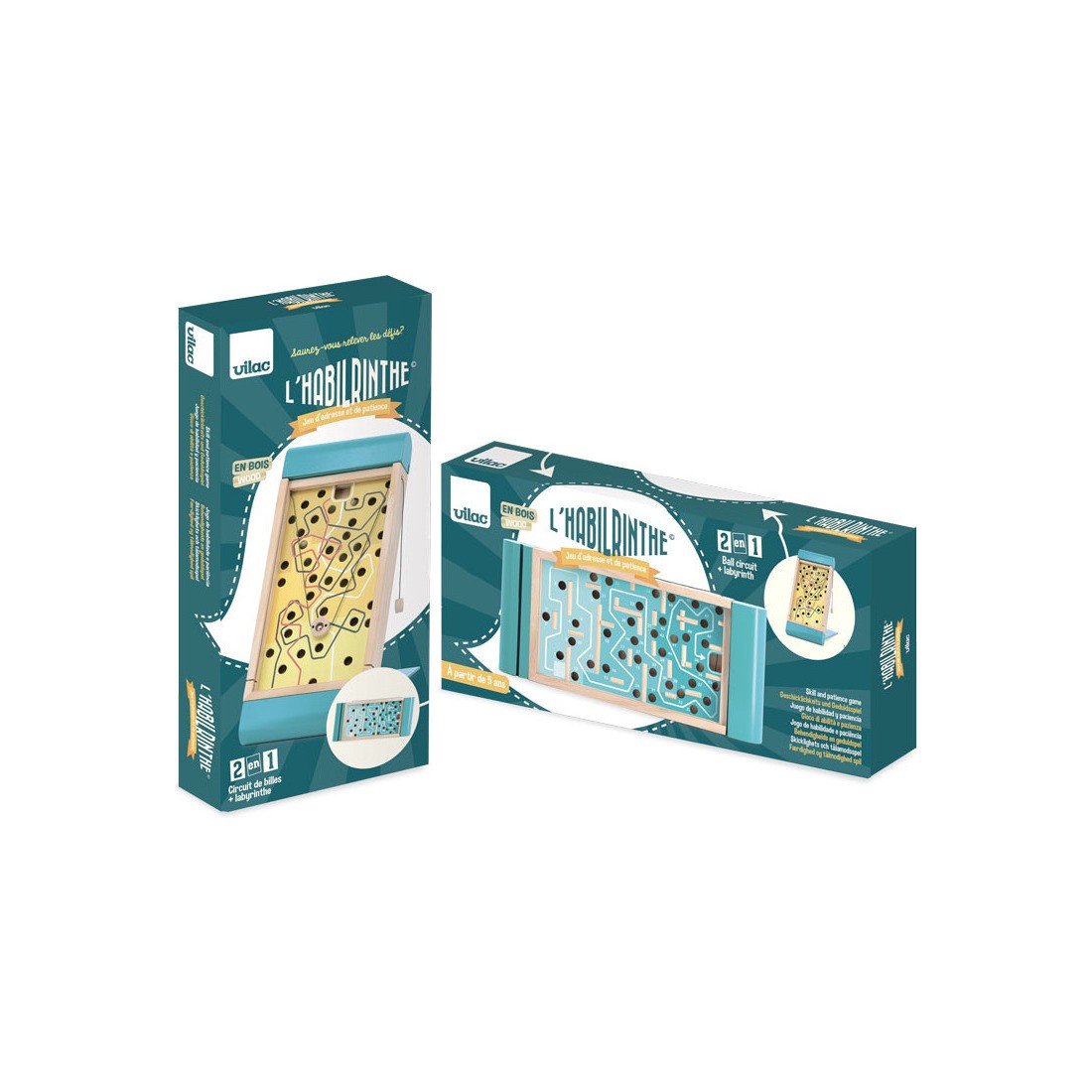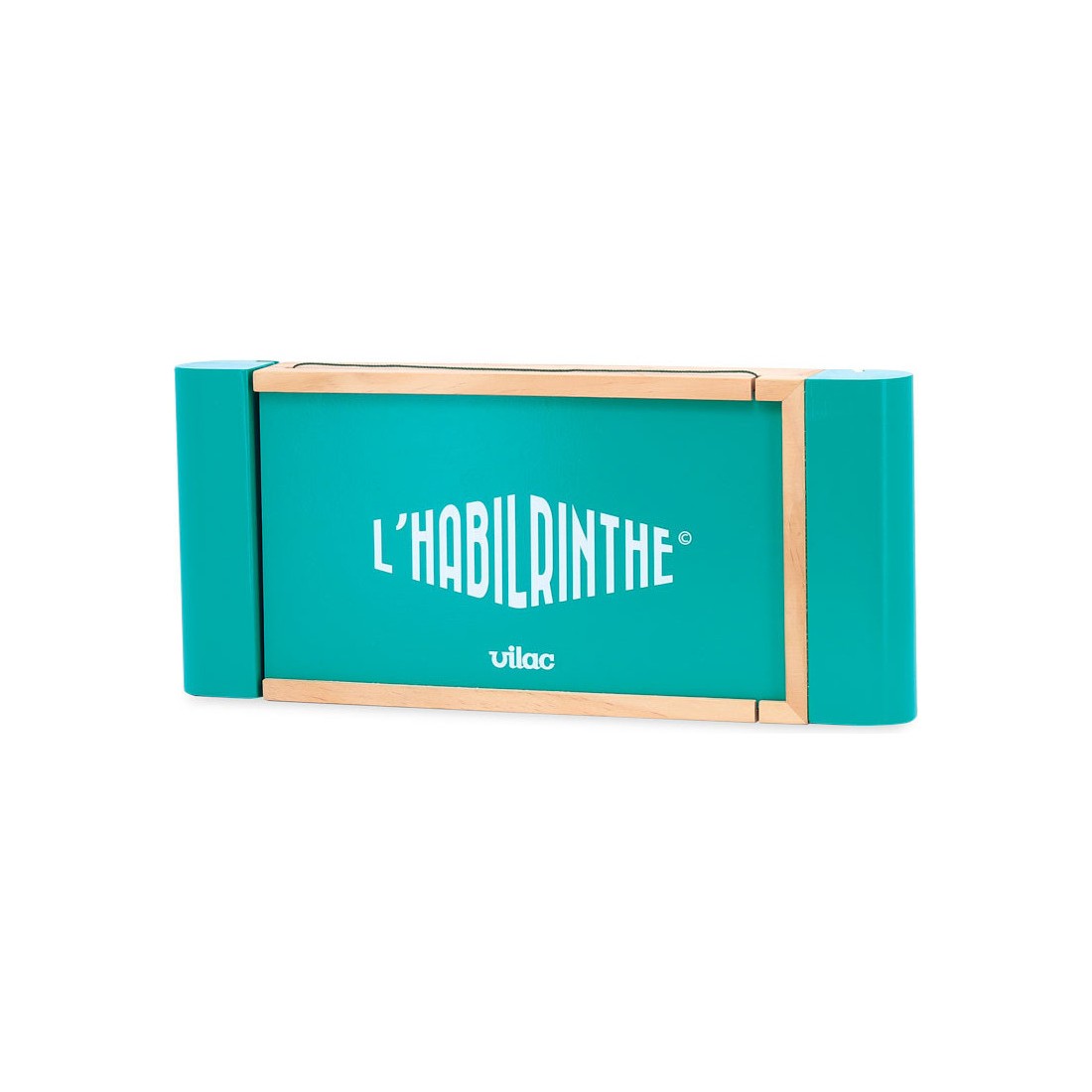 L'Habilrinthe, contraction de ""habile"" et ""labyrinthe"" est un 2 en 1 : D'un côté, en actionnant les 2 poignées, il faut réussir 3 parcours de difficulté croissante en dirigeant la bille entre les trous sans la faire tomber. De l'autre, un autre jeu de labyrinthe qu'il faut parcourir en dirigeant la bille uniquement en penchant le L'Habilrinthe dans toutes les directions.