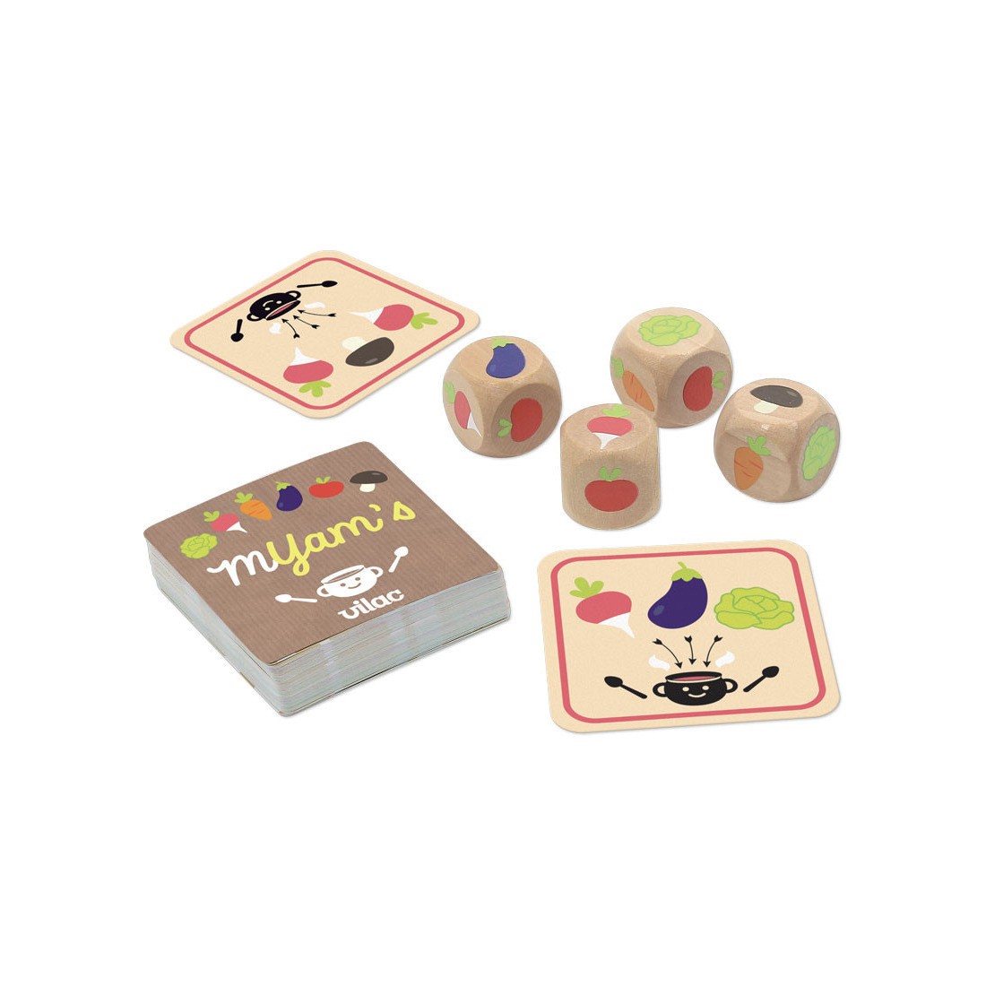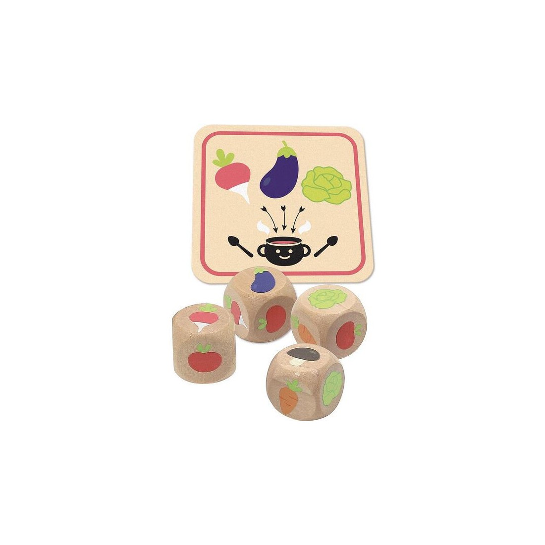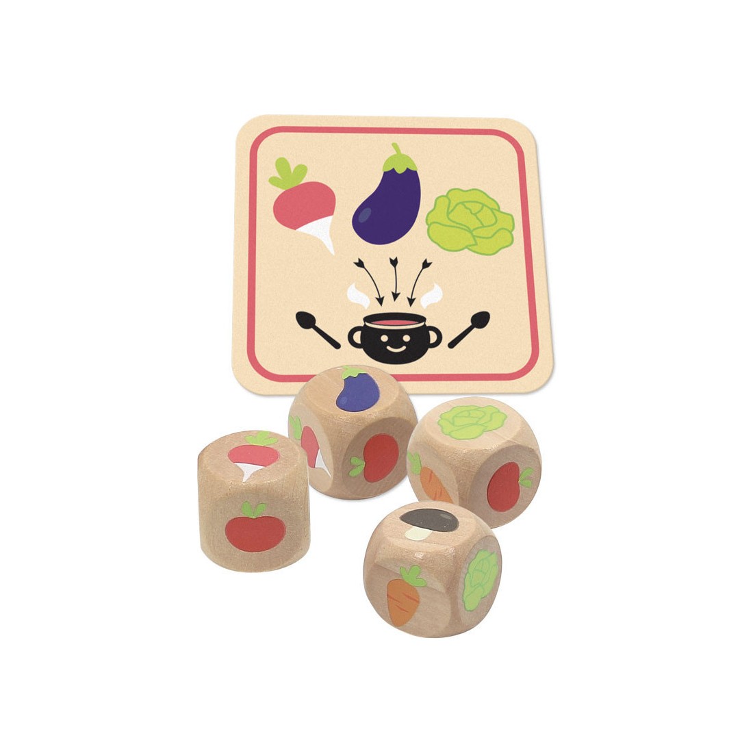 Il faut piocher une carte recette et faire la combinaison avec les dés pour la remporter, hum les bons petits plats ! Le gagnant est celui qui a le plus de bons petits plats à la fin de la partie. • 4 dés en bois. • 55 cartes recette.