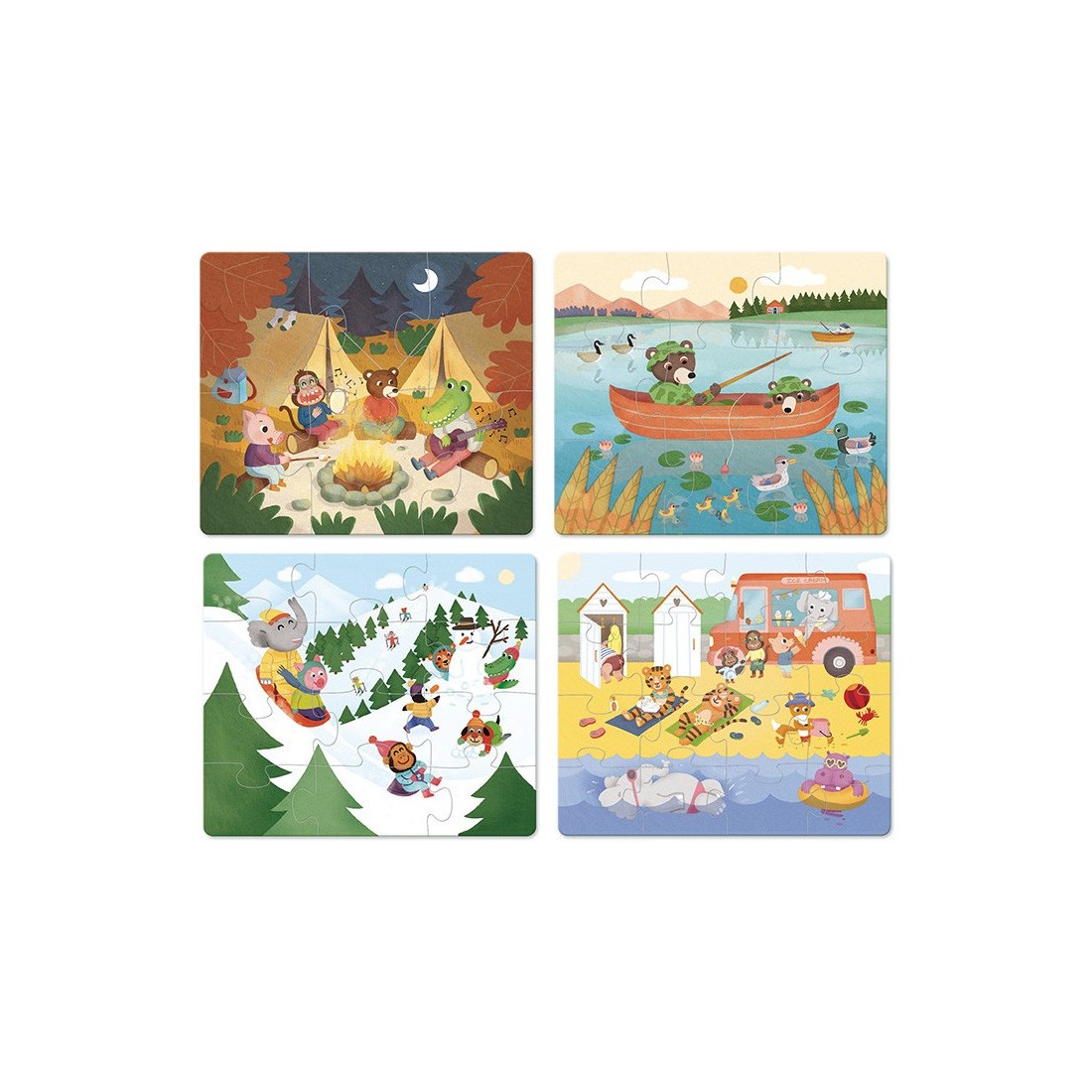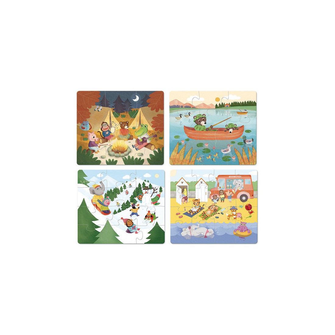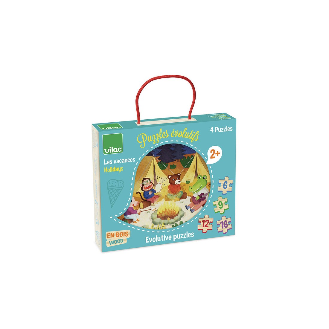 Puzzle évolutifs sur le thème des vacances dans un coffret en bois avec 4 puzzles de difficulté croissante (6, 9, 12 et 16 pcs) A partir de 2 ans.