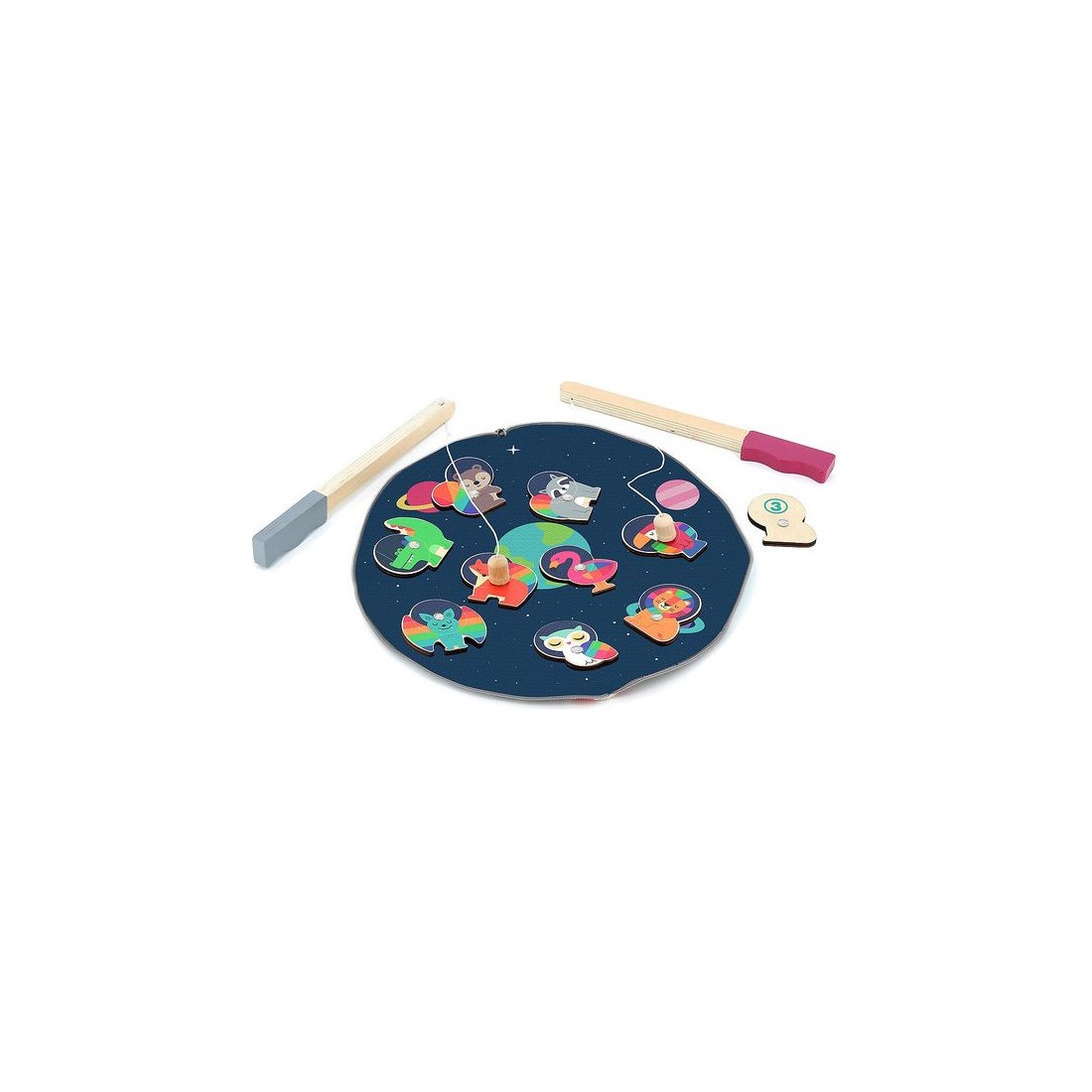 Pour complexifier les choses, le jeu pourra se pimenter de rapidité et de mémorisation : Qui sera celui qui remportera le plus de points quand tous les animaux seront pêchés ? • 2 cannes à pêche magnétiques. • 10 animaux. • 1 vaisseau de rangement qui sert d'aire de pêche dans l'espace quand il est ouvert. • Une règle du jeu.