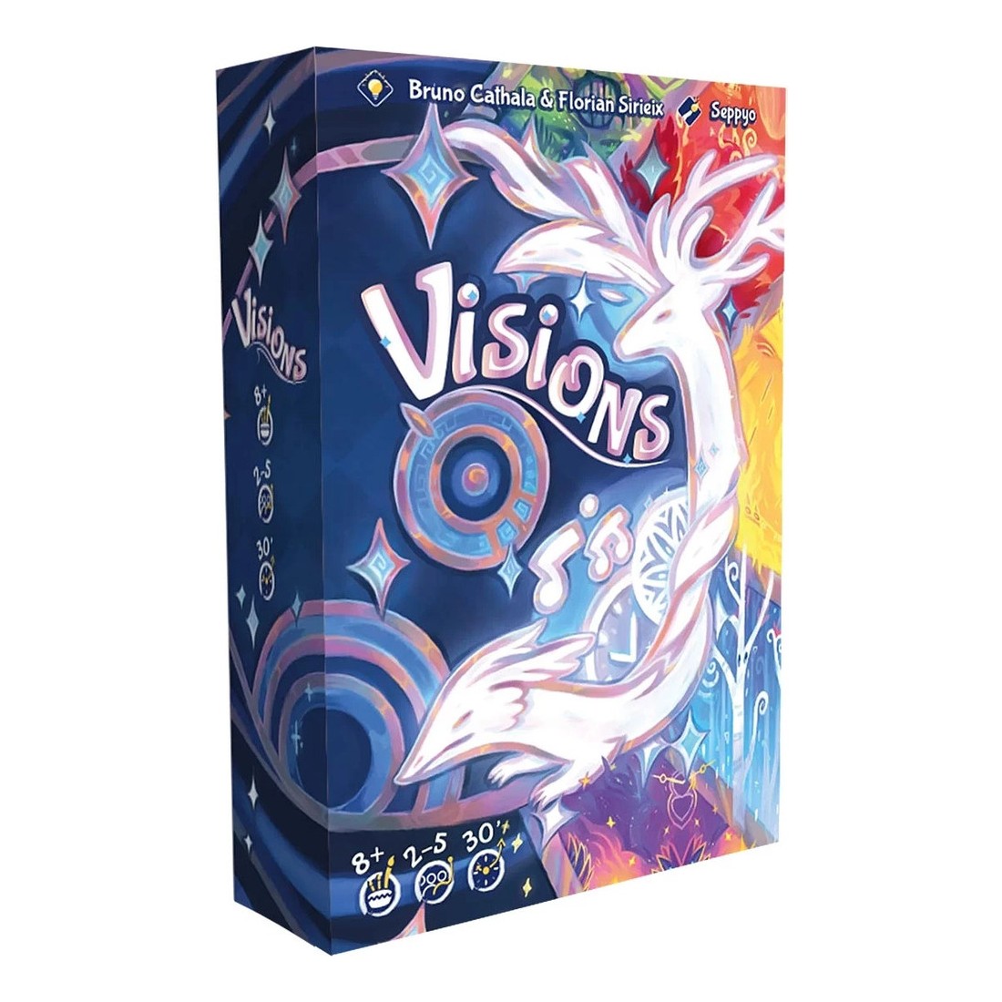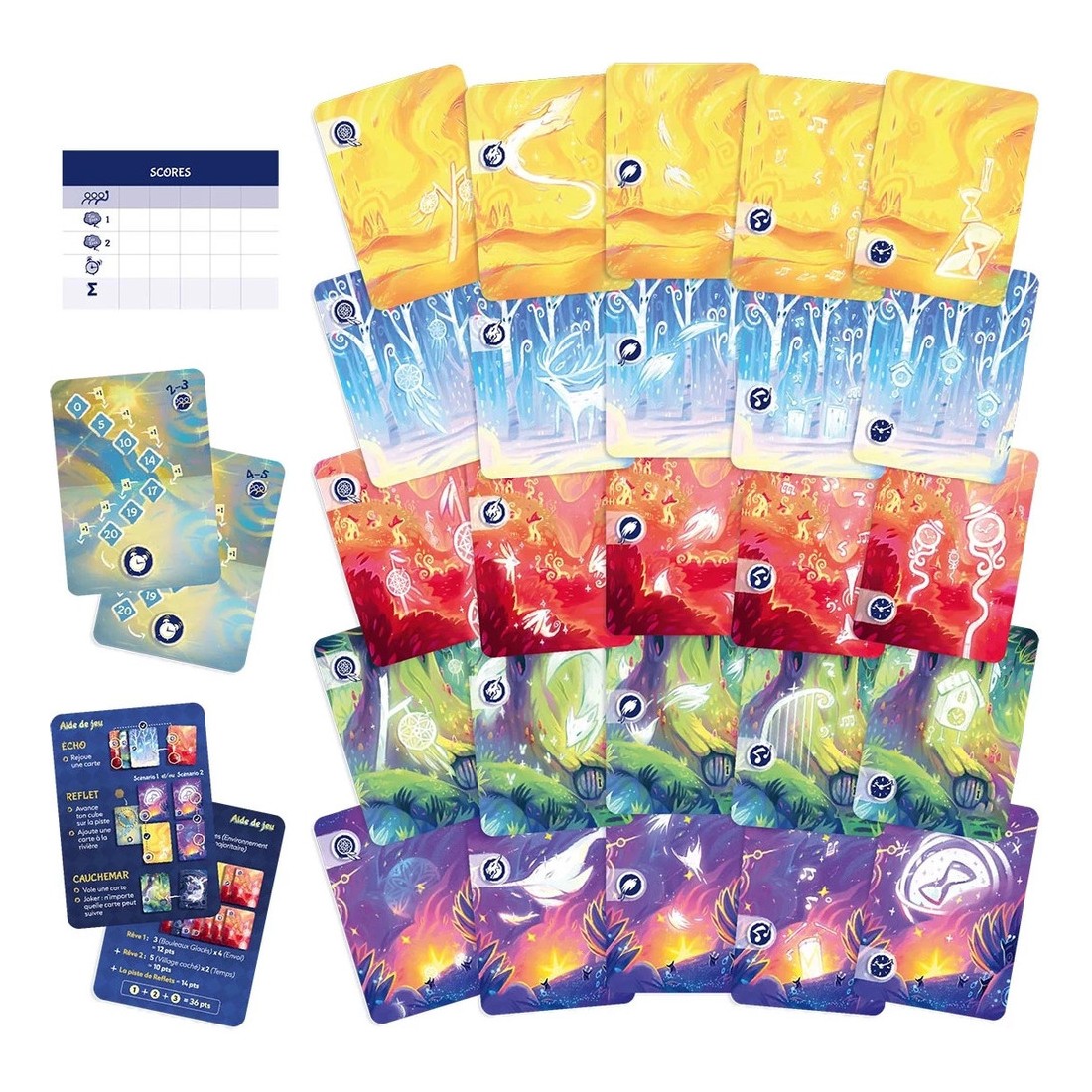 Dans le jeu Visions, chaque joueur plonge dans un univers peuplé de songes étranges, de paysages oniriques et de symboles mystérieux. Votre objectif est de composer des rêves aussi cohérents que possibles en combinant des cartes Songe, chacune associant une Catégorie (Temps, Envol, Musique, Créatures mythiques, Attrape-rêve) et un Environnement (désert ardent, bois enchanté, vallée galactique, village caché ou bouleaux glacés).