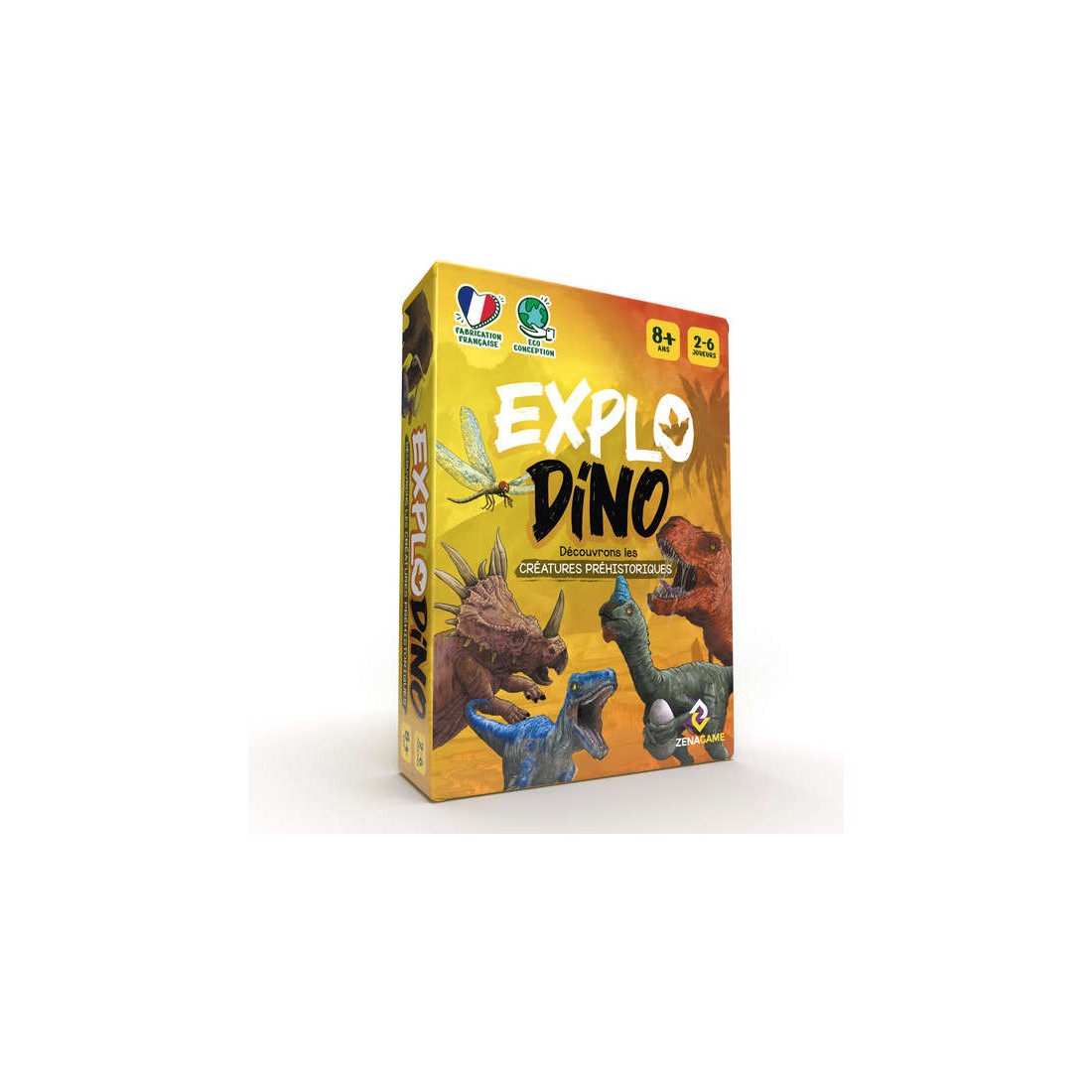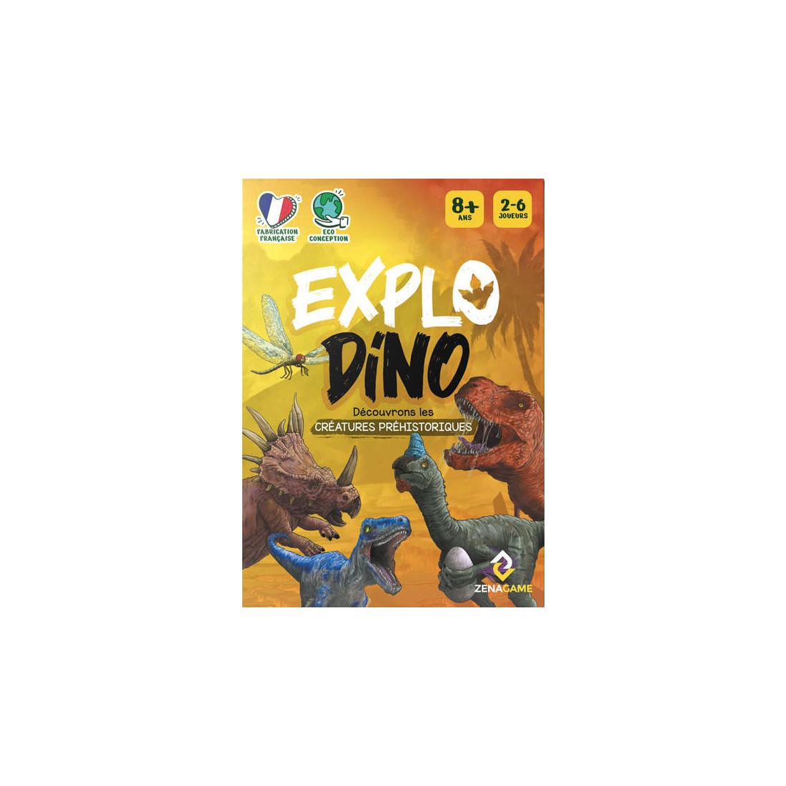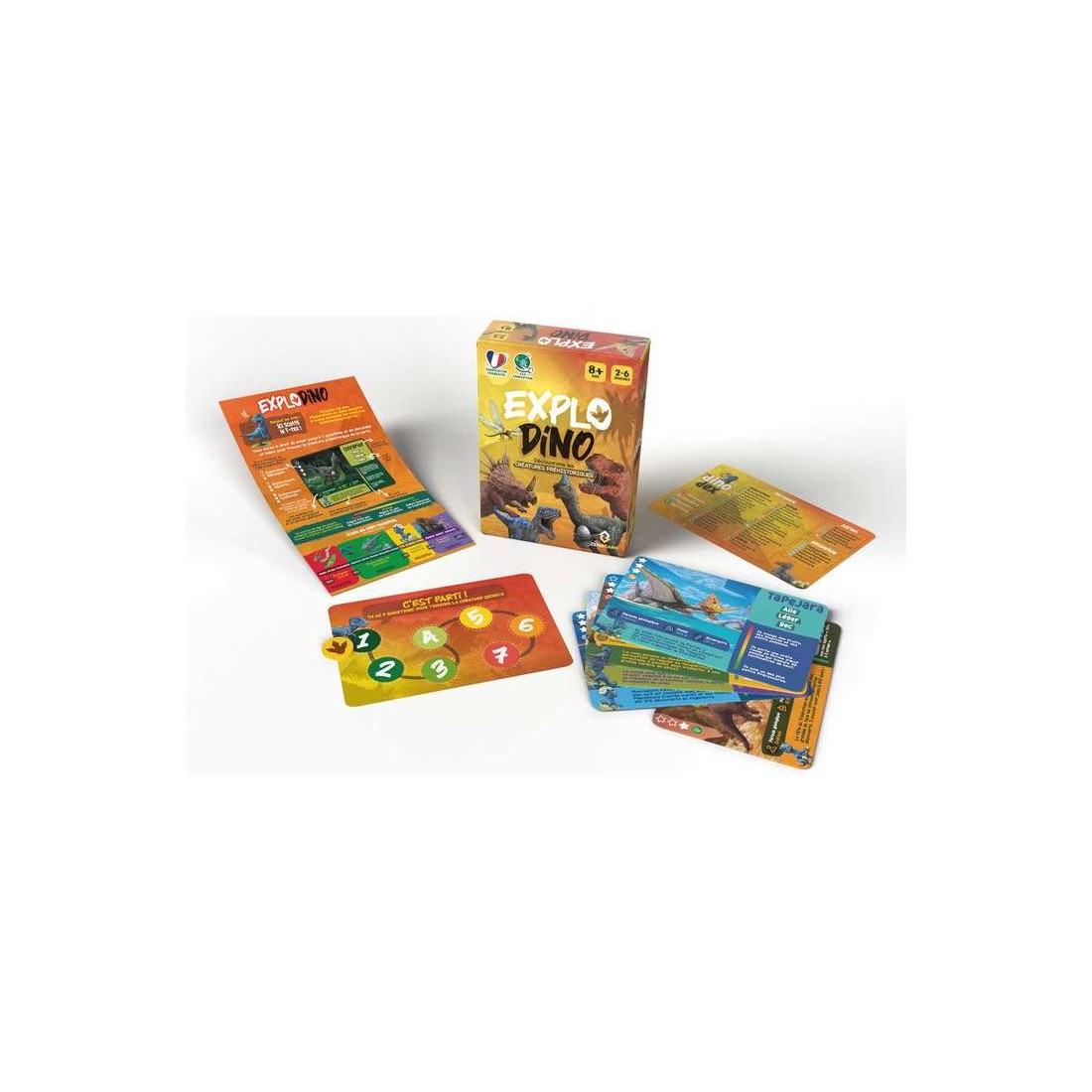 Le jeu est composé de 48 cartes dino à deviner, une carte lexique avec le nom de l'ensemble des créatures présentent dans le jeu, une carte plateau et un pion. Chaque carte dino comporte des informations sur une créature préhistorique : - 3 mots clés - 3 indices de difficulté décroissante - les informations sur le poids, la longueur et l'époque préhistorique de la créature - une information insolite sur la créature préhistorique.