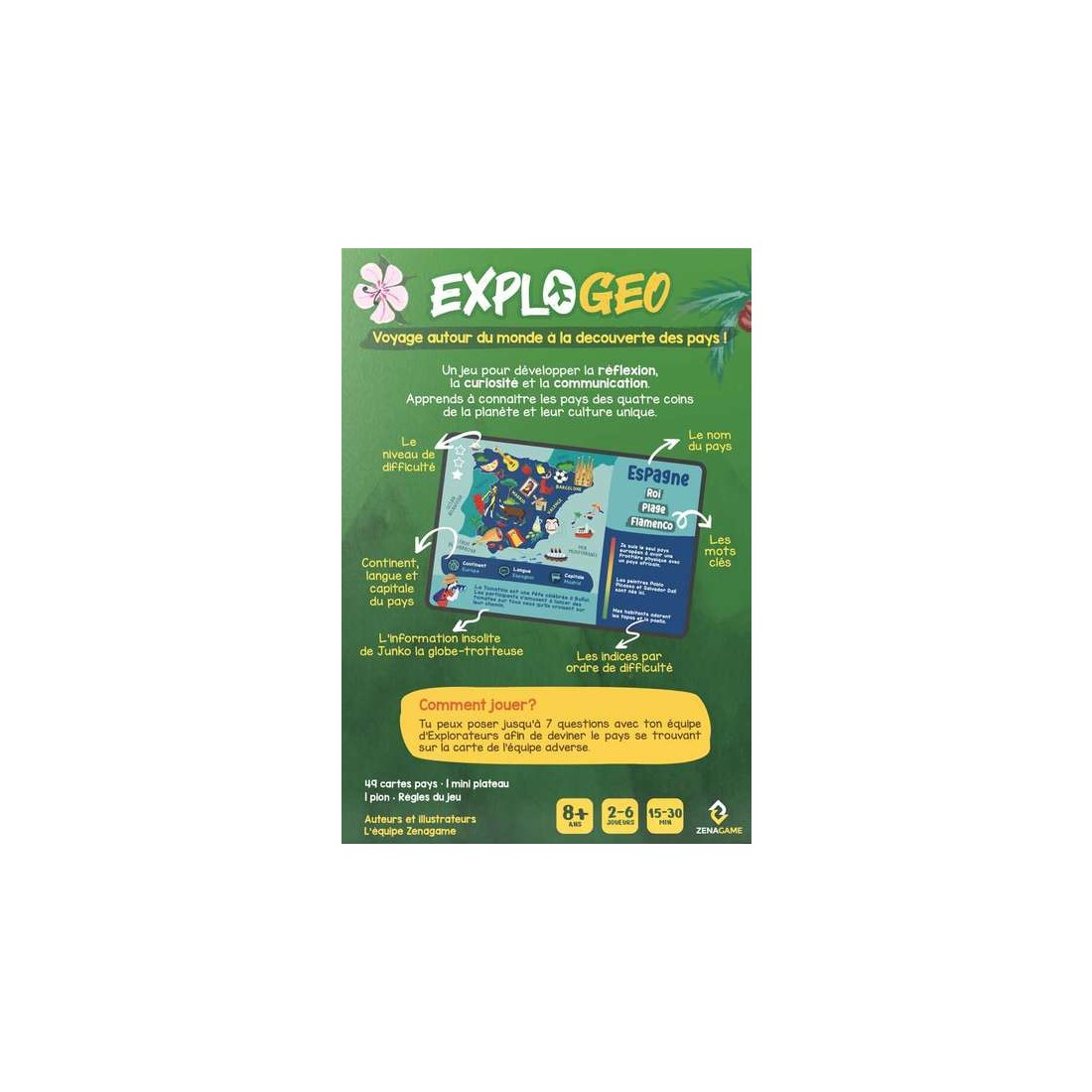 Le jeu est composé de 49 cartes pays à deviner, une carte plateau et un pion. Chaque carte pays comporte des informations sur le pays :