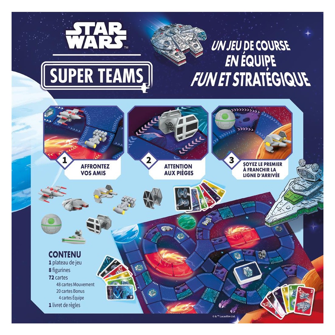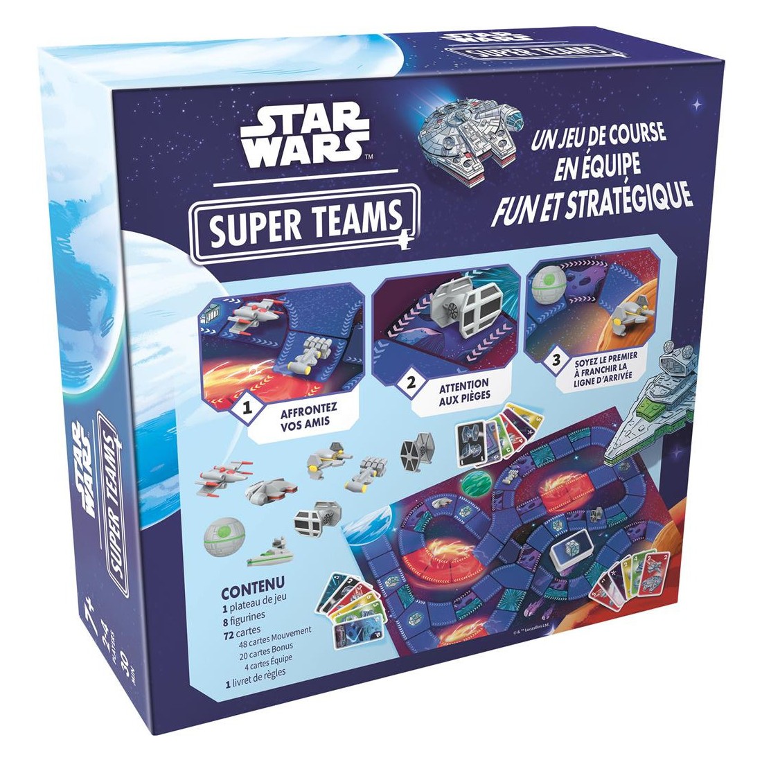 Star Wars Super Teams : une course stratégique et amusante pour toute la famille, dans laquelle votre équipe tentera de franchir la ligne d'arrivée avec tous ses vaisseaux. Il s'agit d'une version thématique indépendante du jeu Sonic - Superteams avec une nouvelle carte, des propriétés de cartes bonus révisées et quelques améliorations des règles.